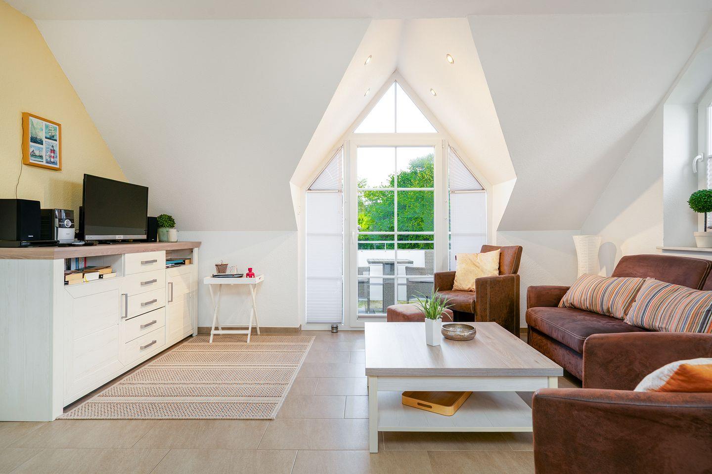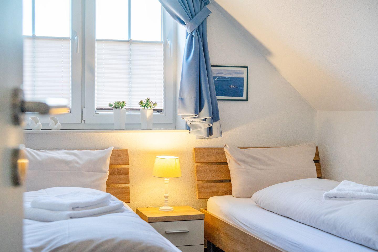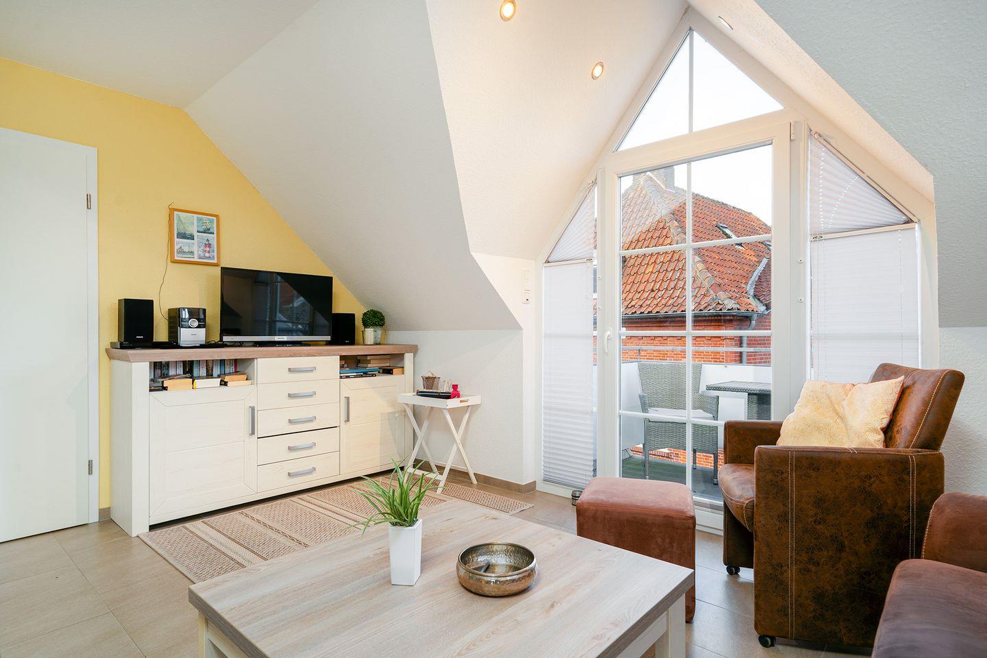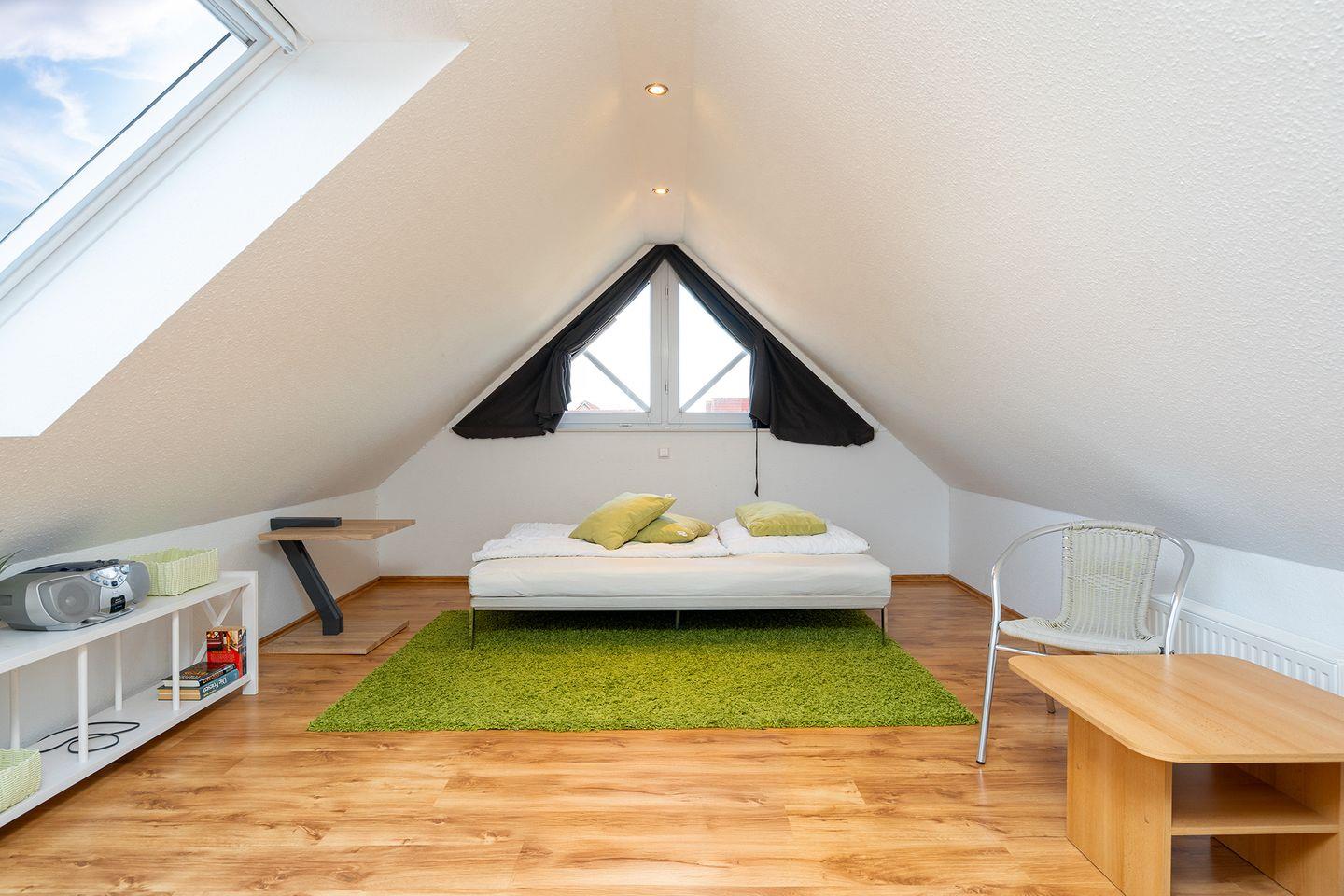 Das Dreiecksfenster im Dachgeschoss mit einem herrlichen Ausblick über Greetsiel kann durch Plissees abgedunkelt werden, ebenso das Dachfenster. Fliegengitter sind vorhanden.