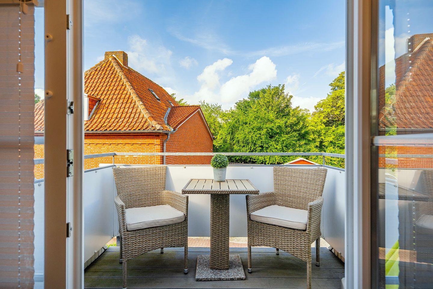 Der Balkon ist mit neuem Mobiliar ausgestattet. Ein Sonnenschirm ist vorhanden.