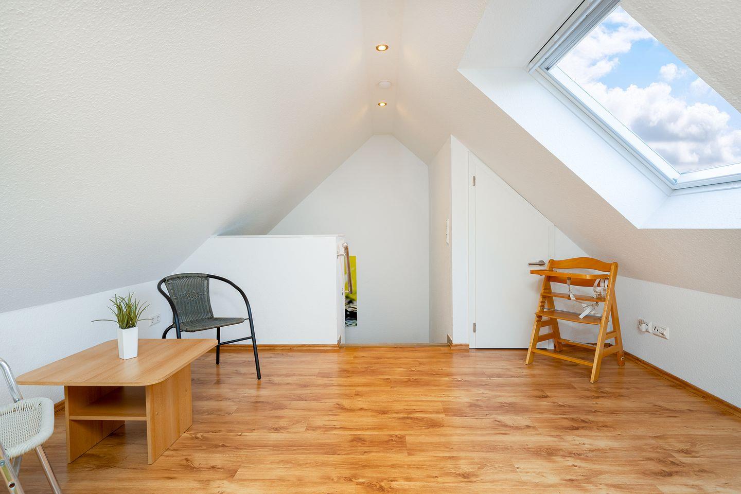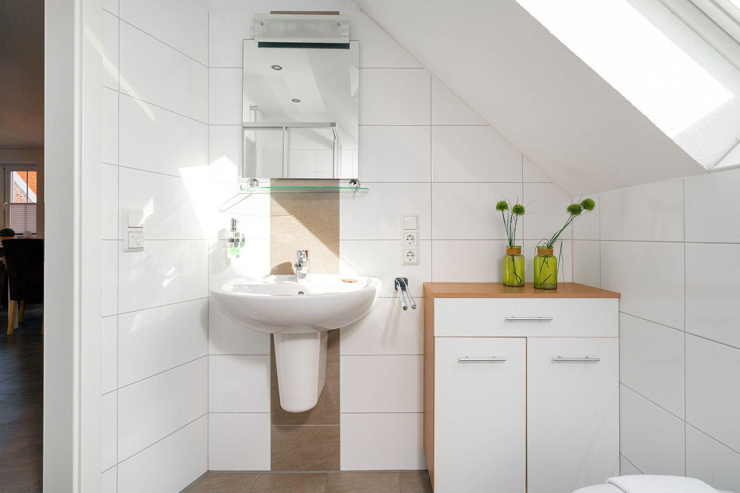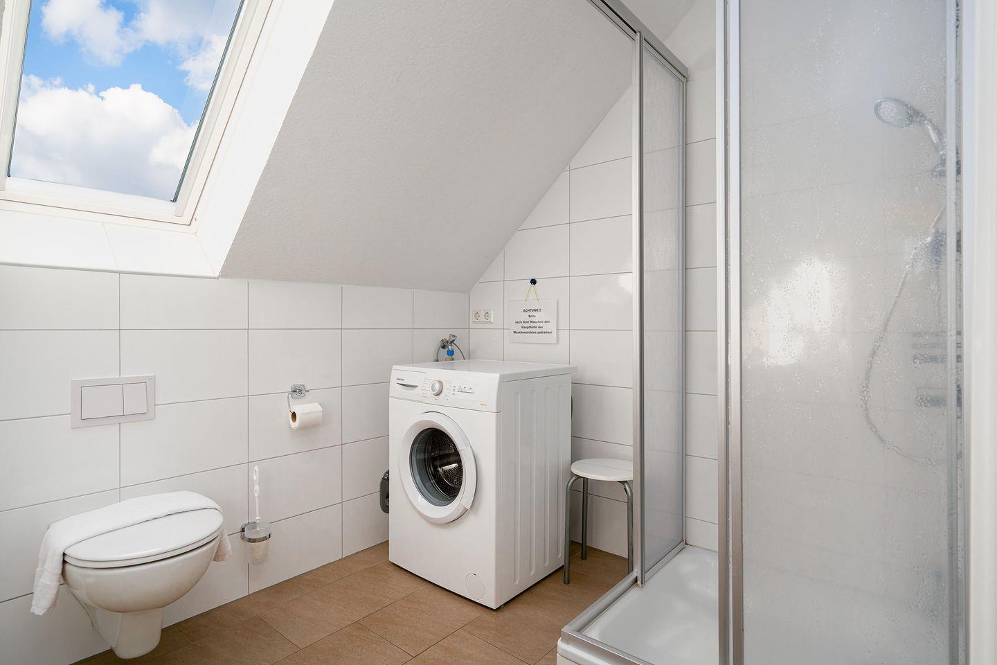 Das moderne Duschbad verfügt über eine Dusche mit einem niedrigen Einstieg, WC, Waschmaschine und Fön. Eine Verdunklungsmöglichkeit für das Dachfenster ist vorhanden.