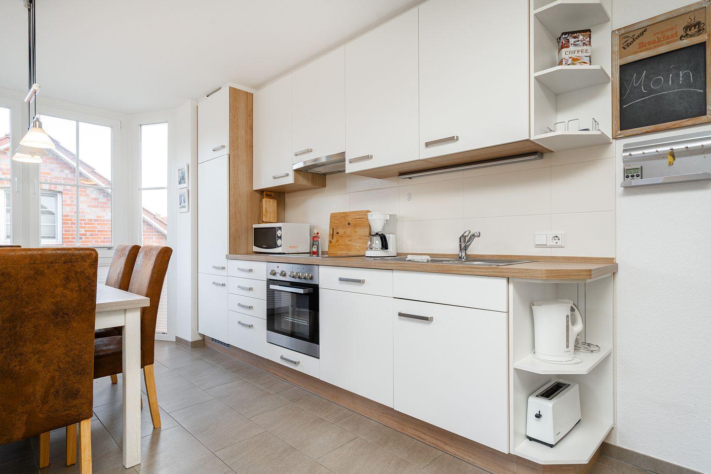 Großer, geschmackvoll eingerichteter Wohn-/Essbereich mit voll ausgestatteter Küche z. B. Kühlschrank mit Gefrierfach, Mikrowelle, Backofen, Spülmaschine, Cerankochfeld, Mixer, Kaffeemaschine, Toaster, Eierkocher, Wasserkocher, u.v.m. Der Esstisch bietet genug Platz für 5 Personen. Das gemütliche Sofa mit 2 Sesseln lädt zu kuscheligen Abenden vor dem Fernseher ein. Es sind auch Bücher und Gesellschaftsspiele vorhanden. Außerdem gibt es einen DVD-Player.