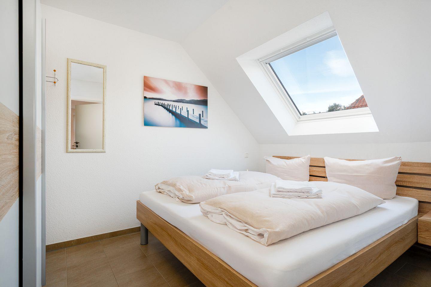 Auf der ersten Etage befinden sich 2 Schlafräume (1 * 1 Doppelbett und 1* 2 Einzelbetten, die aber zum Doppelbett zusammengeschoben werden können). Das Schlafzimmer mit den 2 Einzelbetten verfügt über einen weiteren Flachbildfernseher. Auf der großzügigen Galerie befindet sich ein bequemes Sofa, welches ausgezogen werden und so als Schlafmöglichkeit für die 5. Person genutzt werden kann. Die Galerie ist mit Laminatfußboden ausgelegt.