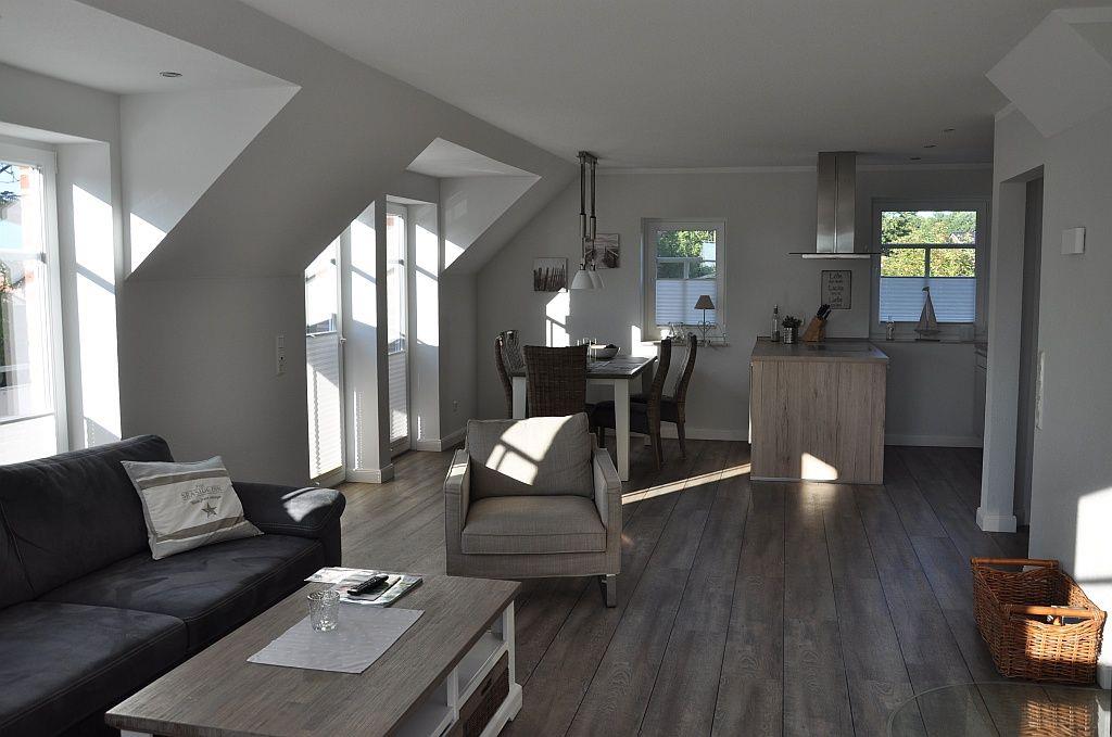 Im lichtdurchfluteten Wohn- und Essbereich mit bodentiefen Fenstern und Zugang zum Süd und Westbalkon erwartet Sie jeglicher Komfort und ein besonderes Flair auf 38 qm: Bequeme Sitzgruppe, ein 49 Zoll 4K Internet/Smart TV (Satellit), Blu-ray/DVD Player und WLAN* nach Registrierung vor Ort.