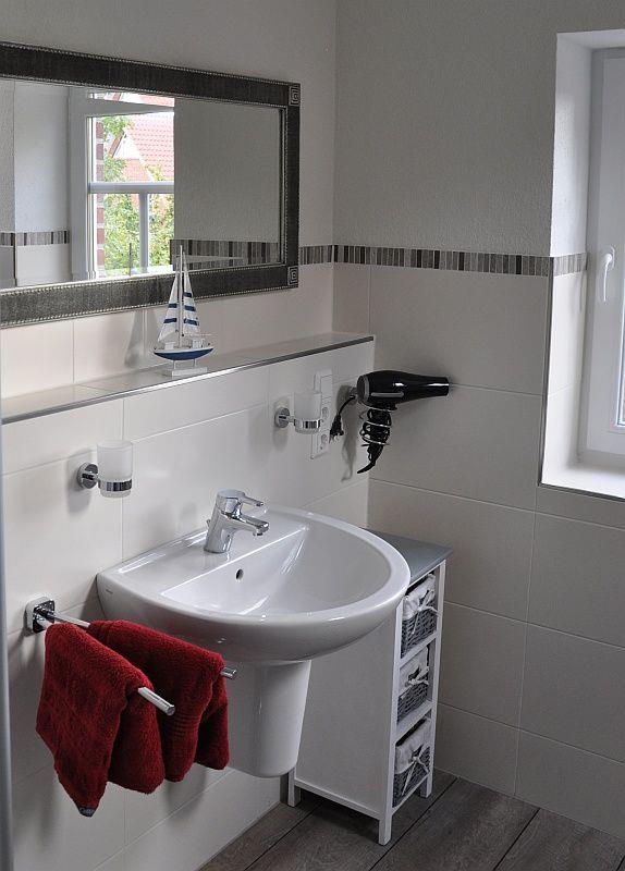Das Tageslicht-Duschbad mit Wellness Regendusche (bodentief) ist mit WC, Waschmaschine und einem Föhn ausgestattet. Ein Bügeleisen, ein Bügelbrett, ein Wäscheständer befinden sich ebenfalls in der Wohnung.
