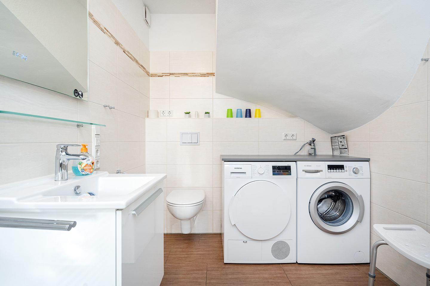 Ein schönes komfortables Bad (Dusche mit flachem Einstieg) mit Handtuchheizkörper und Fön sorgt für Ihr Wohlbefinden. Praktisch ist das zusätzl. Gäste-WC. Waschmaschine, Trockner, Wäscheständer, Bügeleisen und -brett sind ebenfalls vorhanden.
