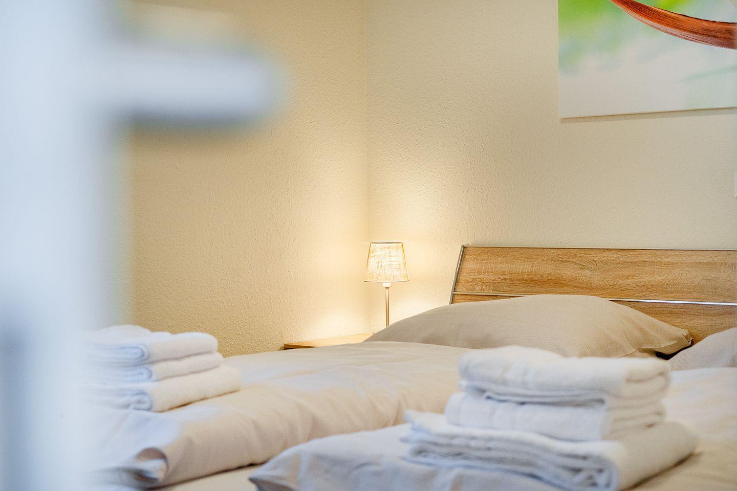 Es gibt 2 Schlafräume (1 x Doppelbett + 2 x Einzelbetten) mit Kleiderschrank und weiteren TV.
