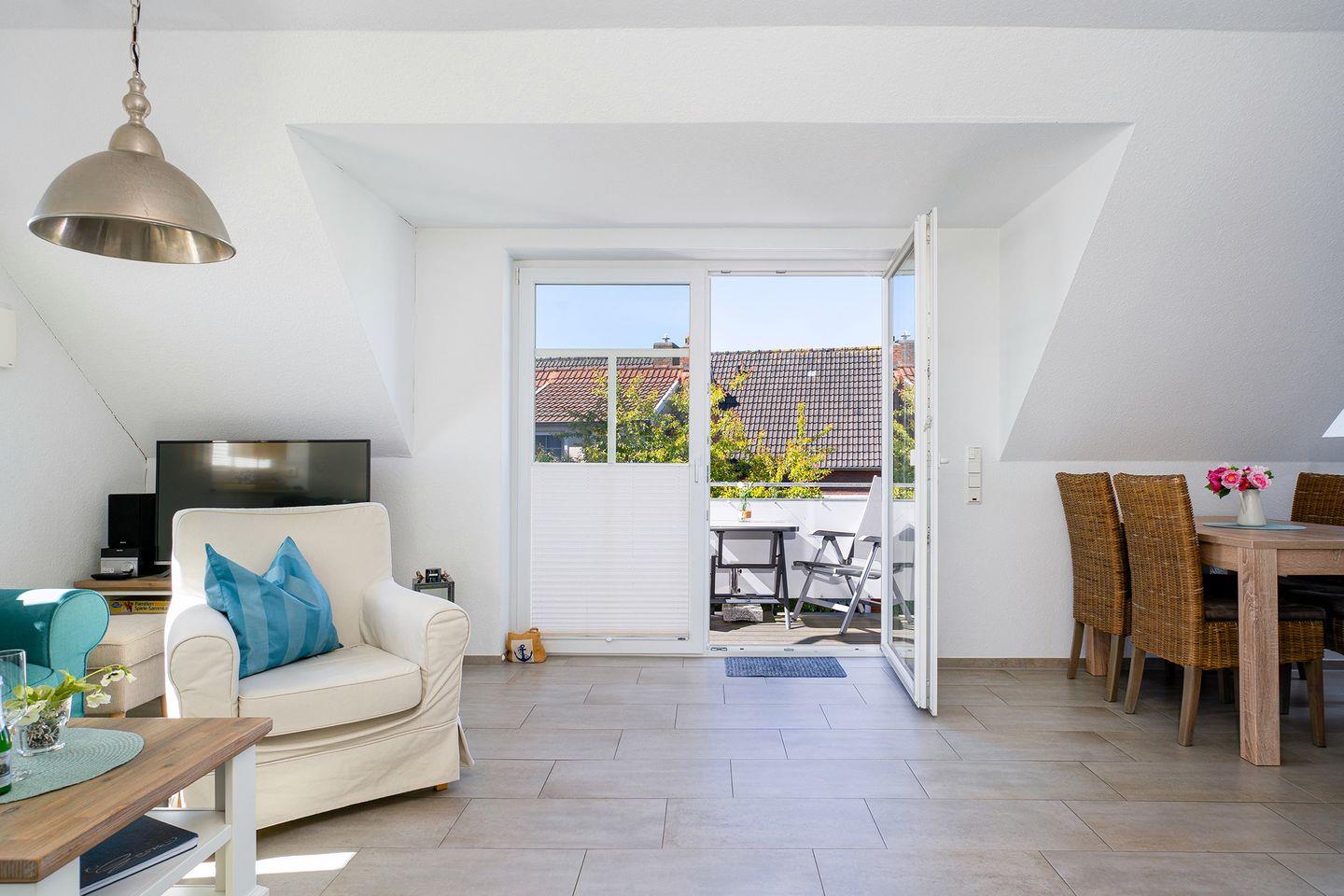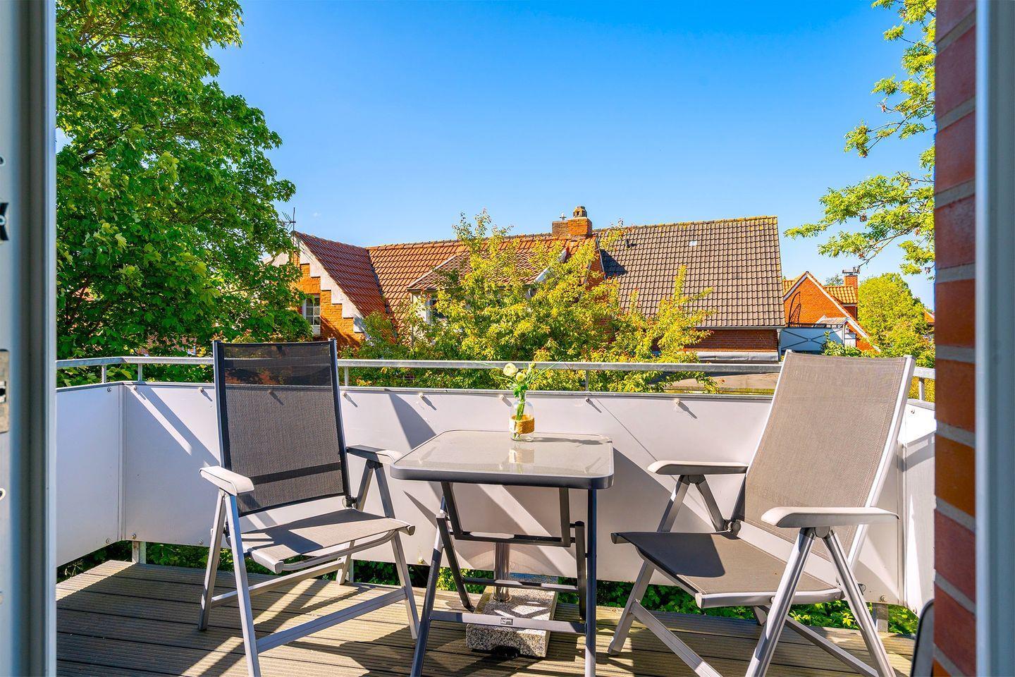 Die Wohnung bietet zudem einen möblierten Balkon mit Sonnenschirm für bis zu 4 Personen, auf dem Sie mit Blick aufs Wasser, schöne Stunden verbringen können.