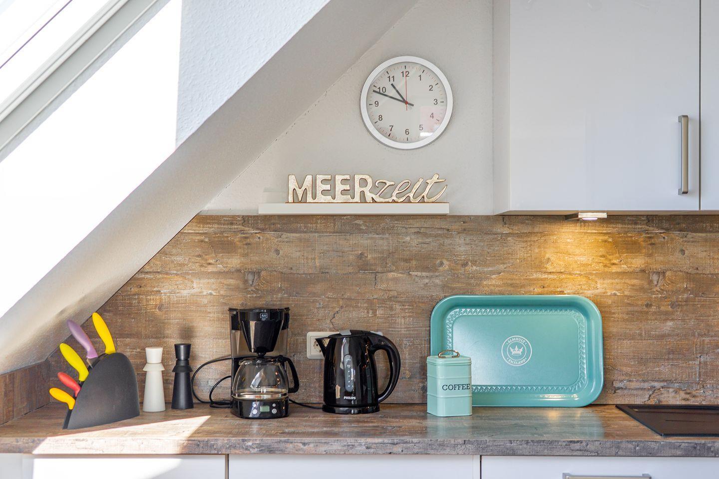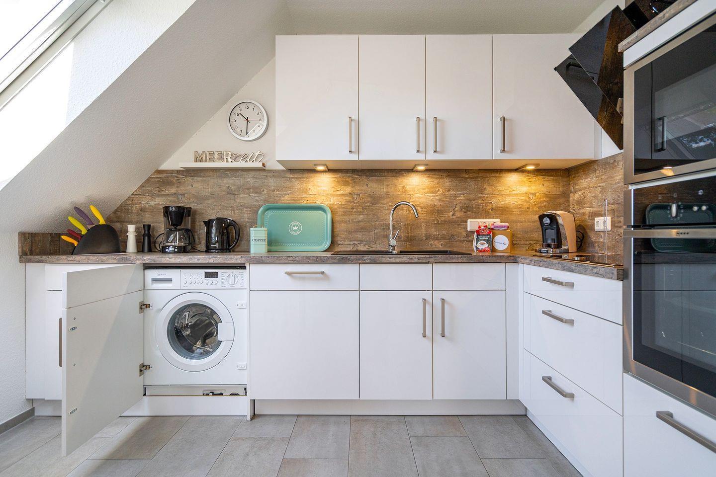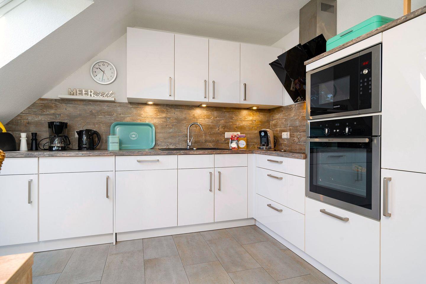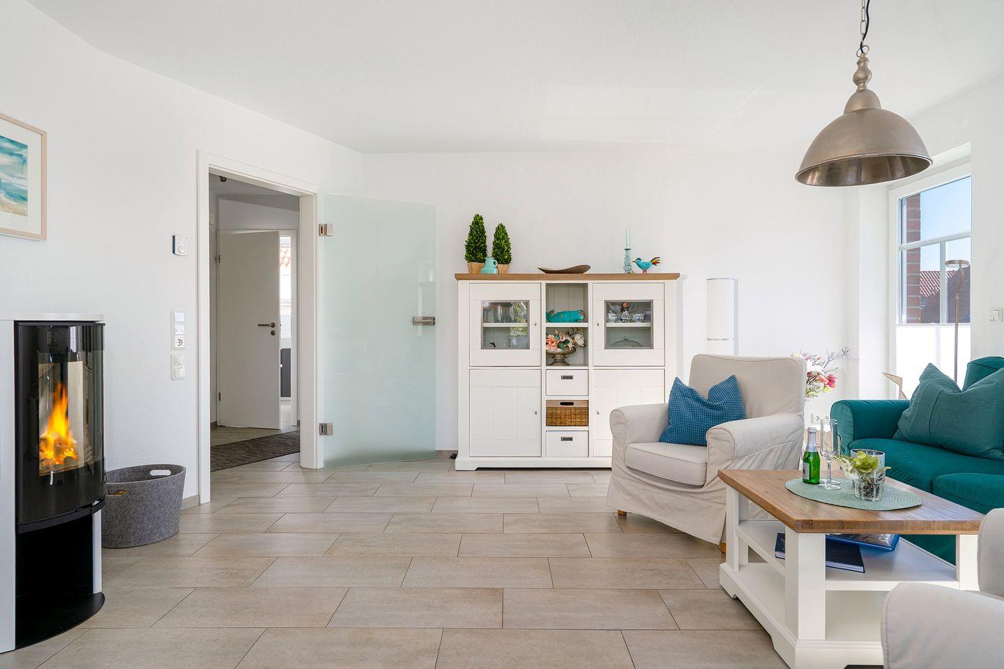 Großer lichtdurchfluteter Wohn-/Essbereich mit schicker voll ausgestatteter Küche z. B. Mikrowelle, Backofen, Spülmaschine, Induktionsherd, Kühlschrank mit Gefrierfach, Kaffeemaschine, Saeco-Automat (Tchibo), Toaster, Wasserkocher, Waschmaschine u.v.m. Ein Kaminofen sorgt für behagliche Stunden in der kälteren Jahreszeit.