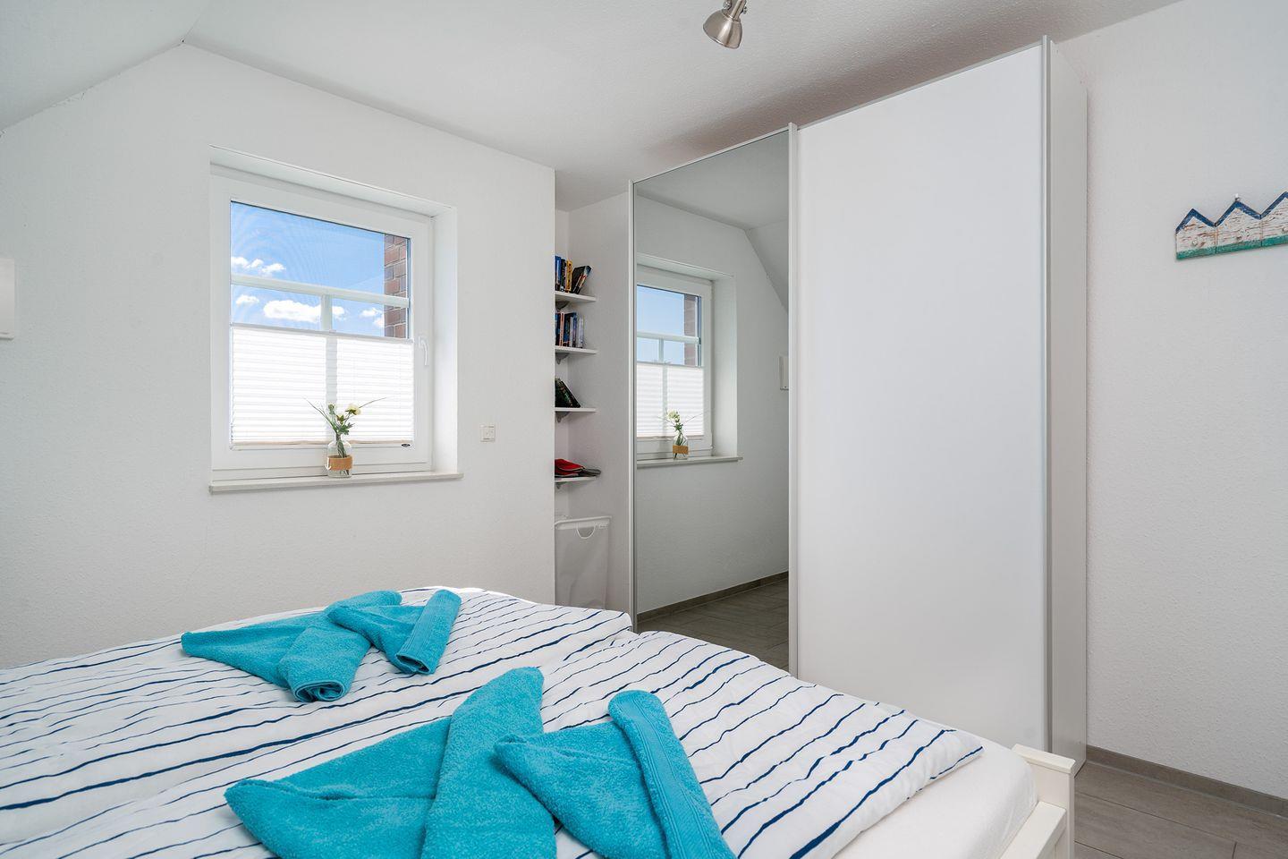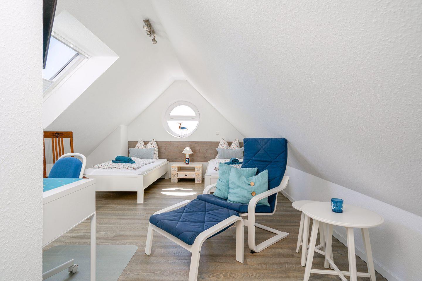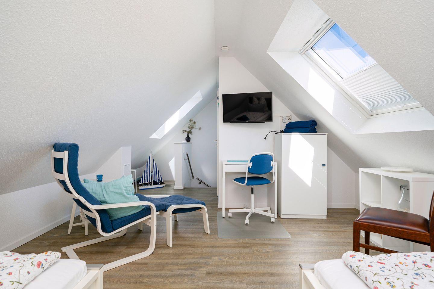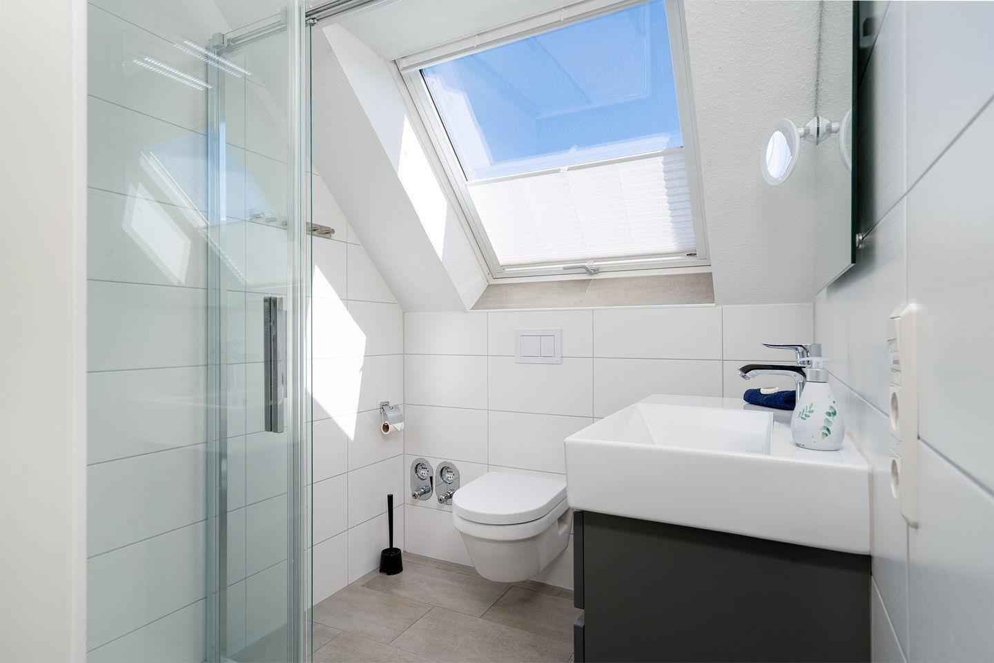 2 Schlafräume, 1 x Doppelbett 1,60 m x 2,00 m und 1 x im Dachstudio 2 Einzelbetten 0,90 m x 2,00 m. Im Dachstudio befindet sich ein weiterer Fernseher und Sitzmöglichkeiten. Ganz neu ab Ende Februar 2024 steht dort auch ein Schreibtisch zur Verfügung, sodass nun auch eine bequeme Homeoffice-Möglichkeit besteht. Das Dusch-Bad (Regenwalddusche) mit WC. Ein Fön ist ebenfalls vorhanden. Außerdem gehört ein Gäste-WC zur gehobenen Ausstattung.