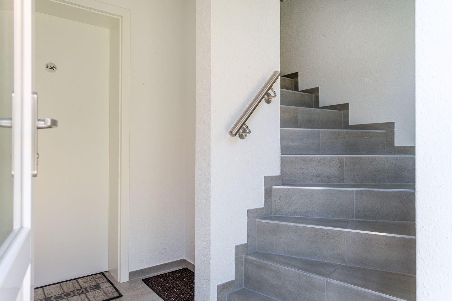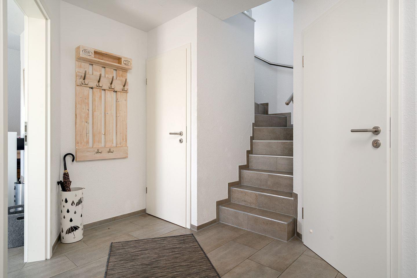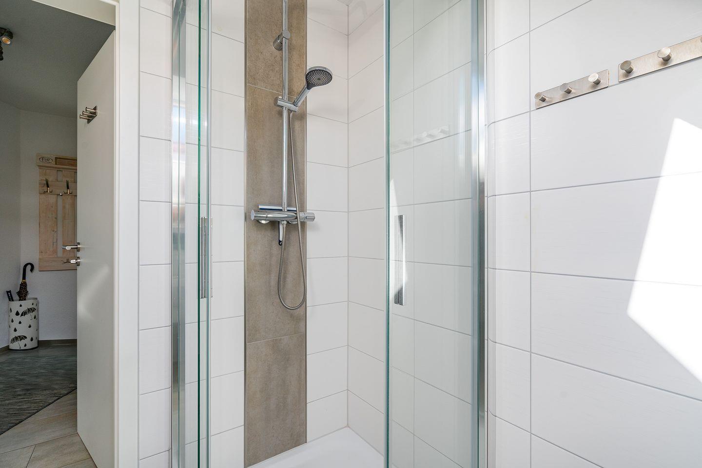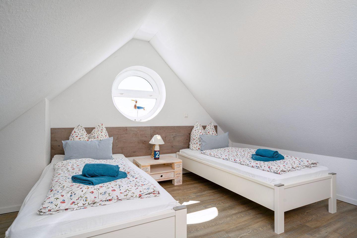 2 Schlafräume, 1 x Doppelbett 1,60 m x 2,00 m und 1 x im Dachstudio 2 Einzelbetten 0,90 m x 2,00 m. Im Dachstudio befindet sich ein weiterer Fernseher und Sitzmöglichkeiten. Ganz neu ab Ende Februar 2024 steht dort auch ein Schreibtisch zur Verfügung, sodass nun auch eine bequeme Homeoffice-Möglichkeit besteht. Das Dusch-Bad (Regenwalddusche) mit WC. Ein Fön ist ebenfalls vorhanden. Außerdem gehört ein Gäste-WC zur gehobenen Ausstattung.