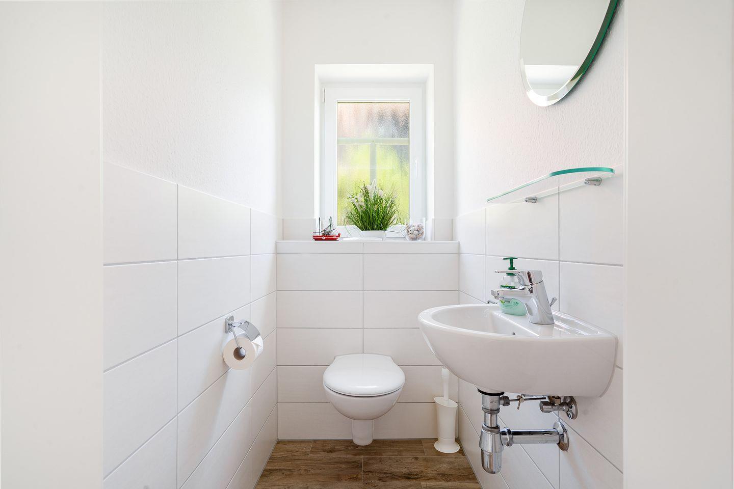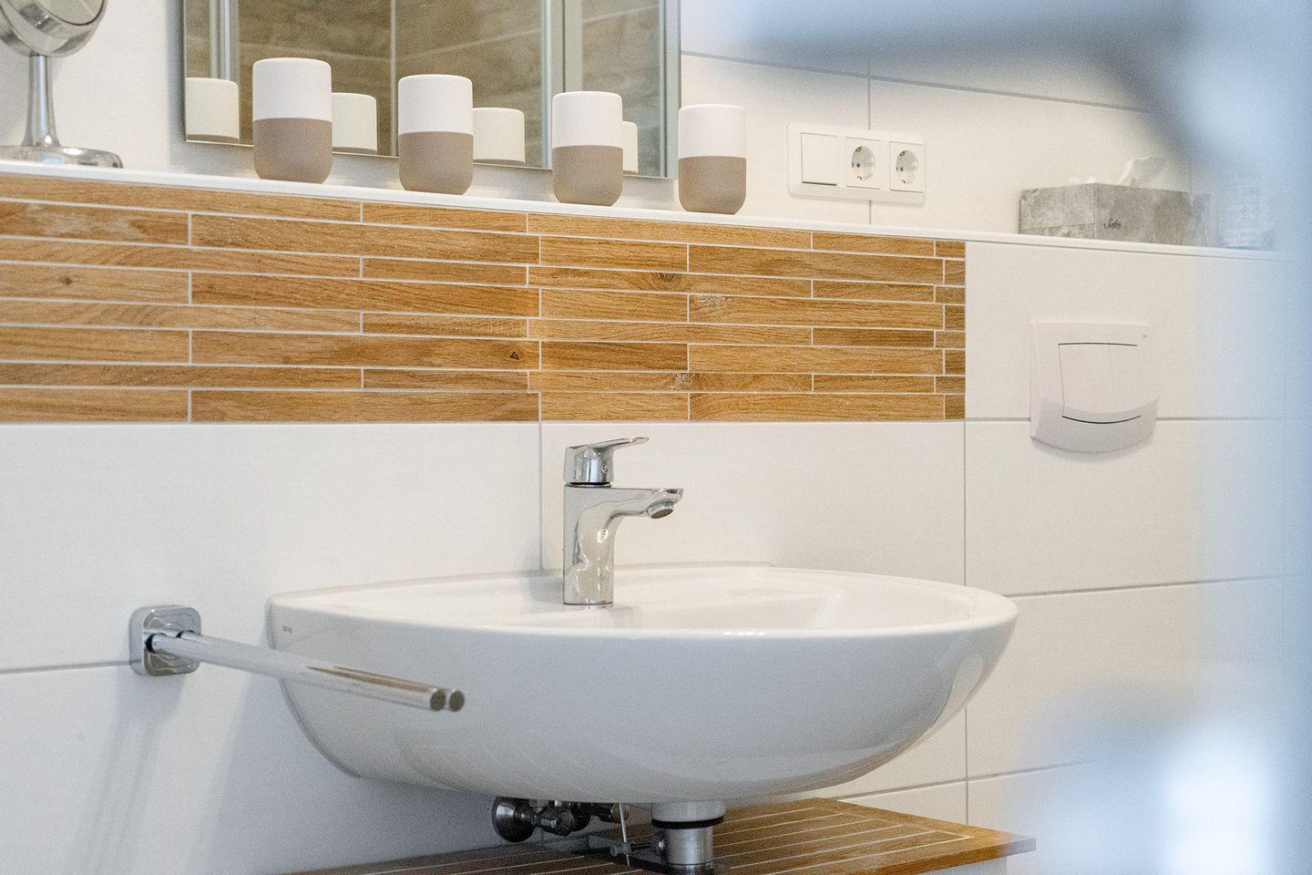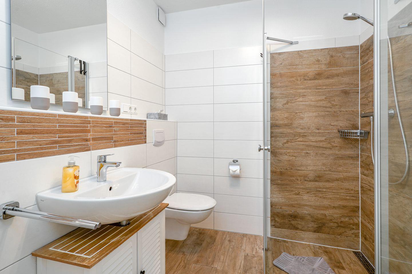 Ein Dusch-Bad (barrierefrei), Fön und Waschmaschine und ein Gäste-WC gehören ebenfalls zur gehobenen Ausstattung.