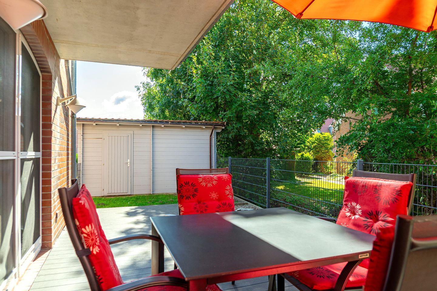 Terrasse mit Mobiliar, der Garten ist komplett umzäunt.