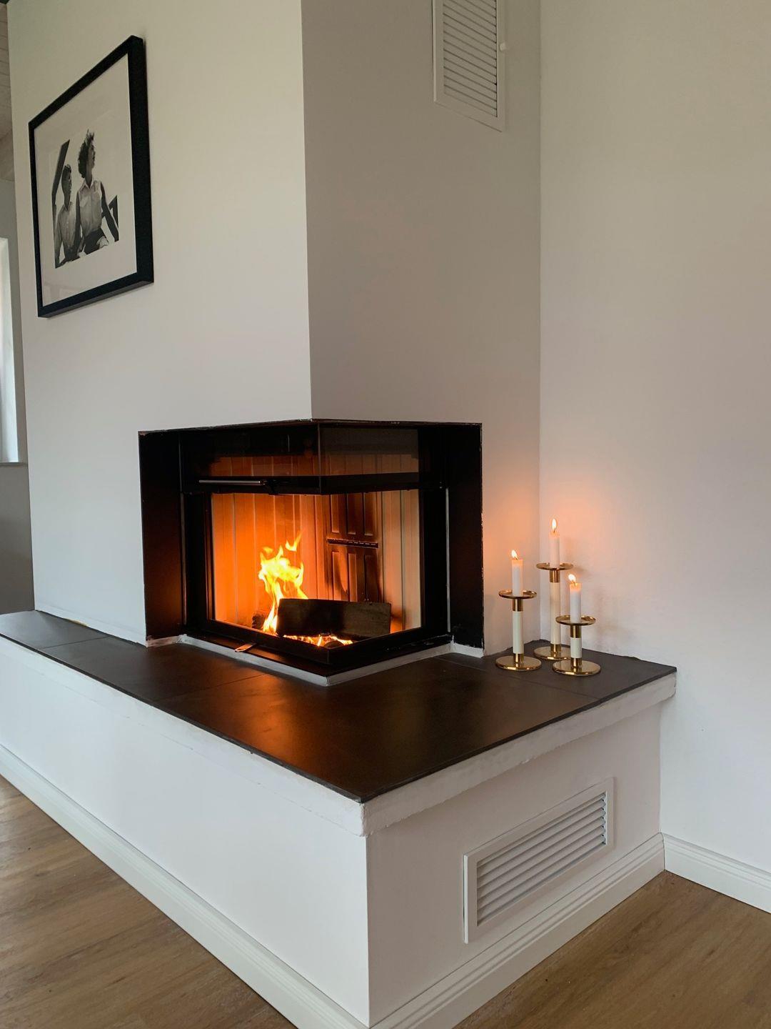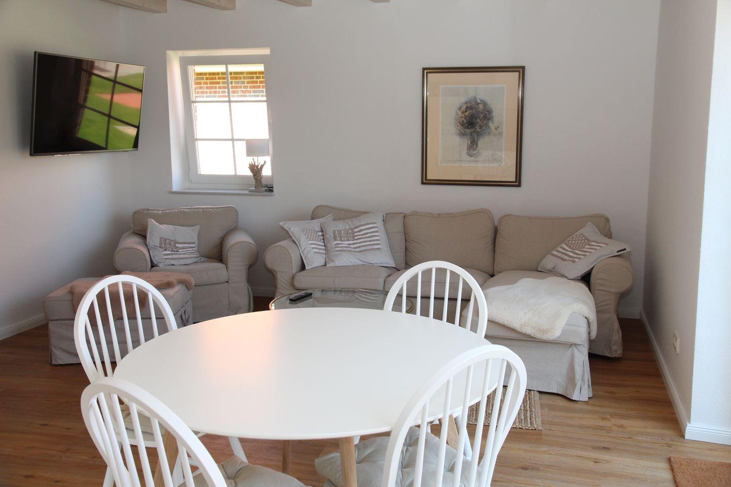 Im angrenzenden lichtdurchfluteten Ess- und Wohnbereich finden Sie einen runden Esstisch, an dem Sie mit bis zu 6 Personen Platz nehmen können und eine großzügige Sitzlandschaft mit modernem Flachbildfernseher. Die hell lasierte Holzdecke, indirekte Beleuchtung und ein moderner Eckkamin sorgen hier für elegante Gemütlichkeit. Hier können Sie nach dem Deichspaziergang oder dem Saunagang stilvoll entspannen und in der kalten Jahreszeit für wohlige Wärme sorgen.