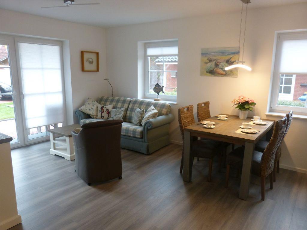 Der große Wohn-Essbereich bietet Platz für 4 Personen und verfügt neben Couchtisch und Sideboard über eine bequeme Couch, einen Ledersessel und einen Fernseher mit 43 Zoll Bildschirm. Die moderne Landhausküche ist mit allem ausgestattet, was Ihr Urlauberherz begehrt (Geschirrspülmaschine, Cerankochfeld, Backofen, Kaffeemaschine, Senseopadmaschine, Kühlschrank mit Gefrierfach, Eierkocher, Wasserkocher, Toaster u.v.m.), sogar ein Teegeschirr und Espressotassen mit Desserttellern sind vorhanden. An dem Esstisch finden 4 Personen bequem Platz, um Mahlzeiten einzunehmen oder Spieleabende zu veranstalten.