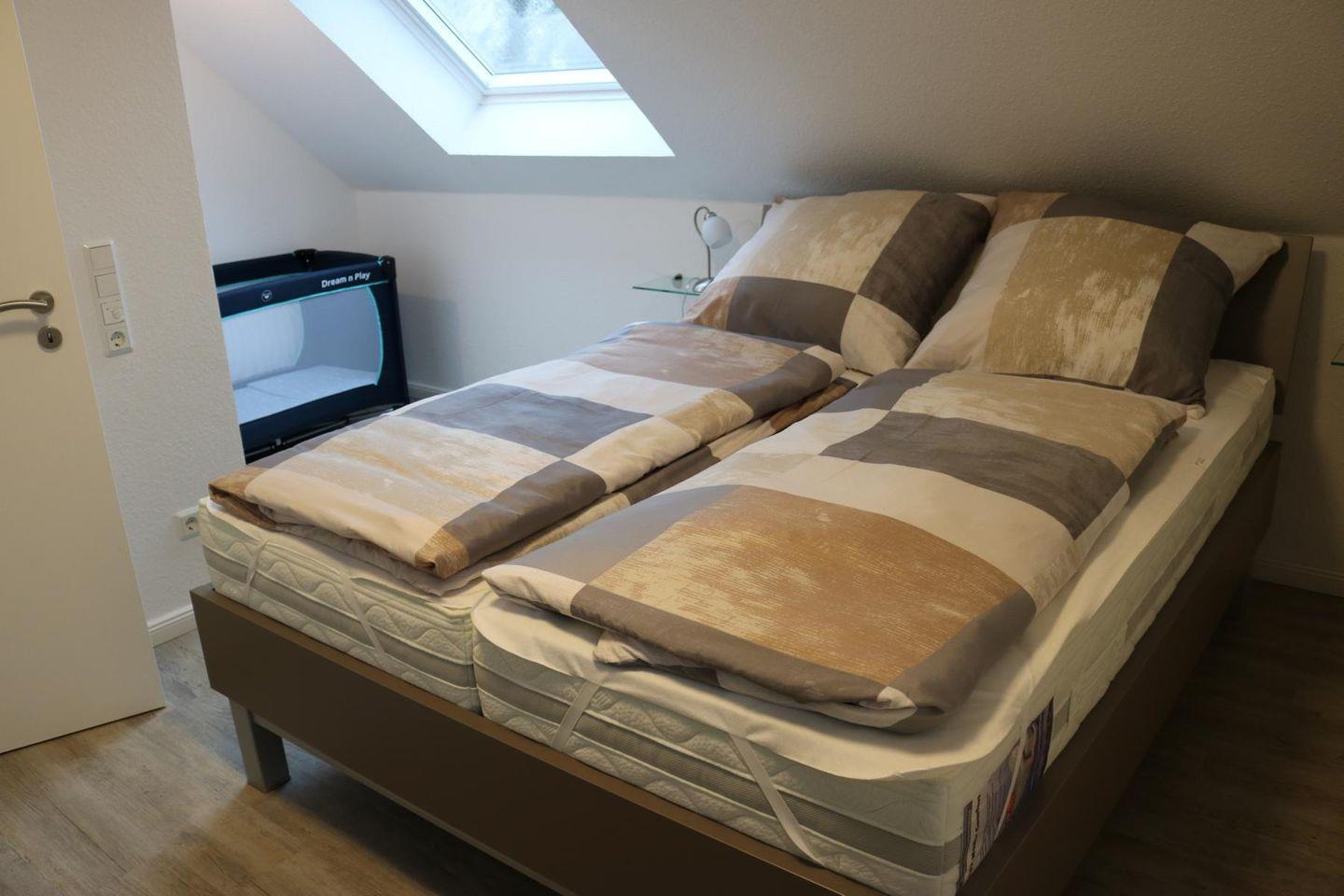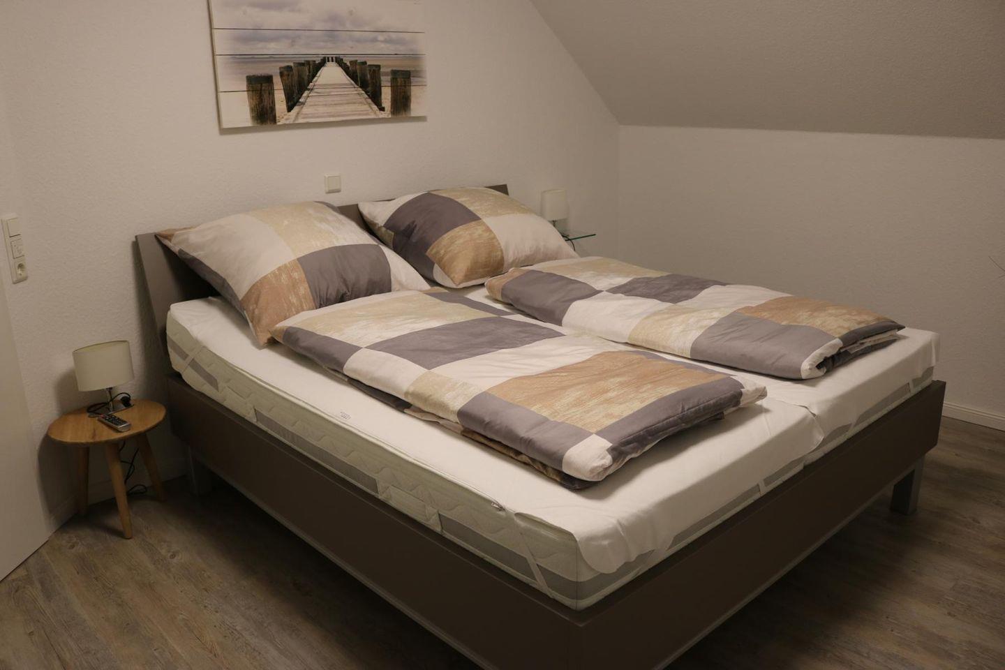Ein Schlafzimmer mit komfortablen Doppel-Boxspringbett befindet im Erdgeschoss, zwei weitere Schlafräume mit Doppel-Boxspringbetten und großen TV-Geräten im Obergeschoss. Hier befindet sich auch ein zweites Duschbad (mit Fön).
