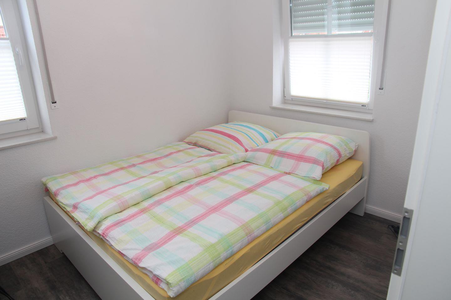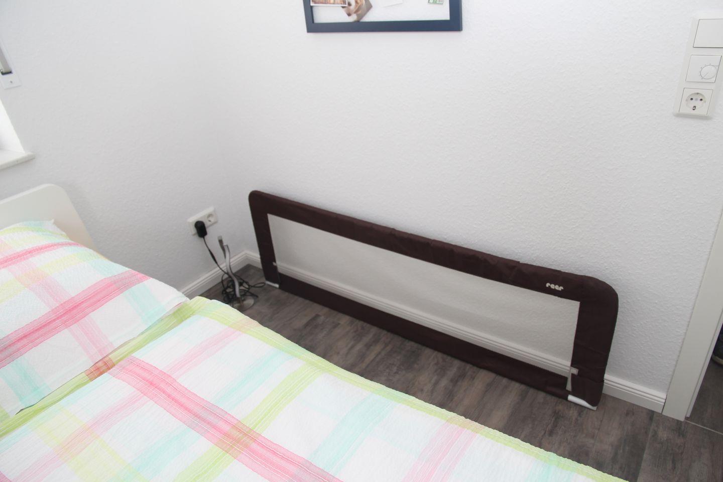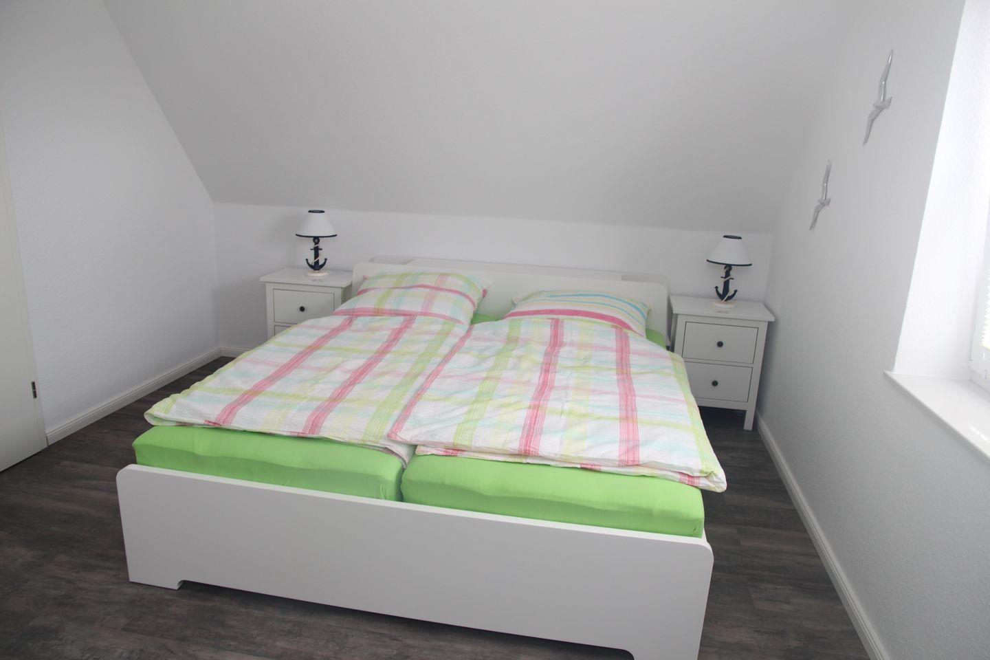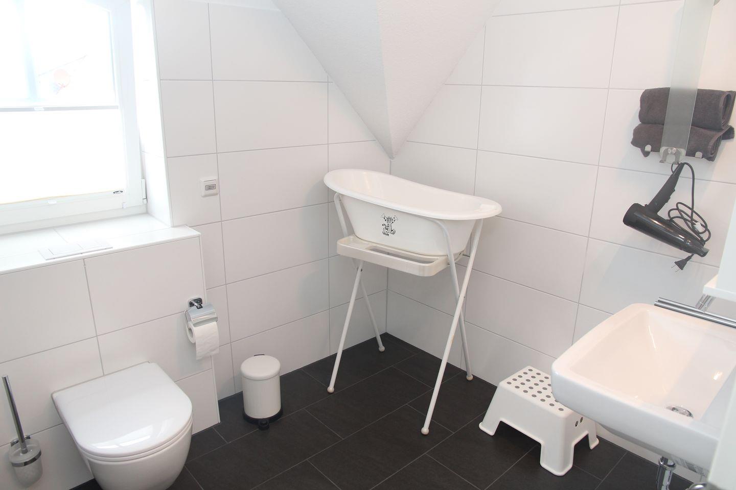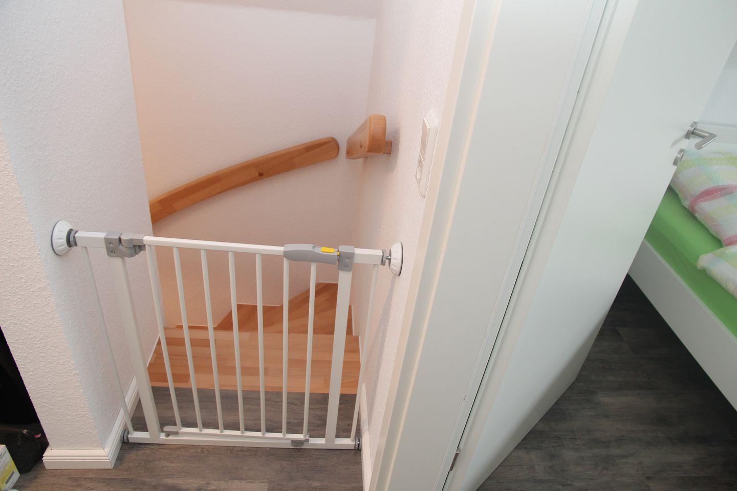 Im Obergeschoss befinden sich zwei gemütliche Schlafzimmer (eines mit Doppelbett, Kleiderschrank, Kinderbettchen und Wickelkommode, das andere mit 2 Einzelbetten/Kleiderschrank) und ein weiteres Badezimmer mit Dusche, Babybadewanne, Waschmaschine und Trockner. Die Treppe ist mit einem Treppenschutzgitter gesichert.