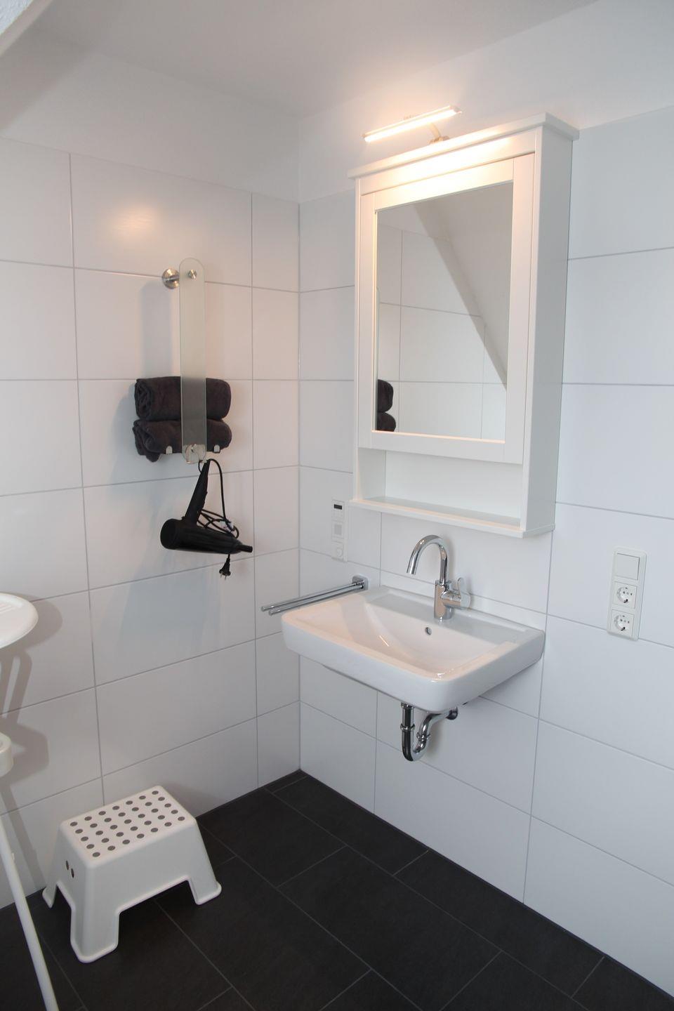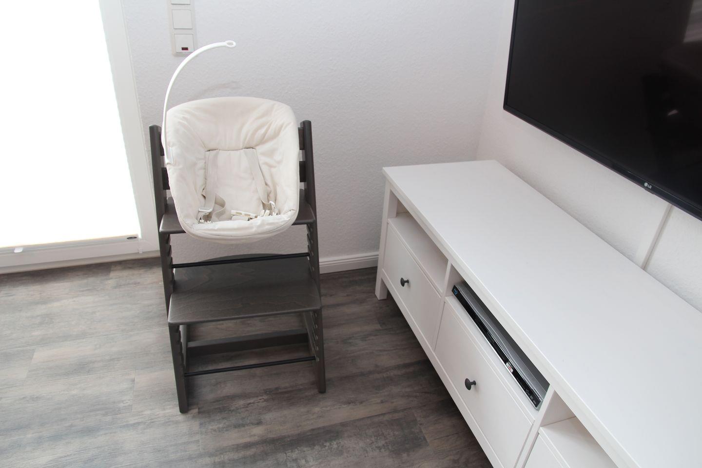 Im Erdgeschoss befindet sich ein moderner Wohn-Essbereich mit moderner, komplett ausgestatteter Küche mit Geschirrspülmaschine, Kühlschrank mit Gefrierfach, Mikrowelle, Cerankochfeld, Kaffee-/Filter-/Padmaschine, Toaster, Mixer u.v.m. Ein großer Esstisch mit 6 Stühlen sowie einem Kinderhochstuhl (mit Babyschale) steht für gemütliche Familienzusammenkünfte zur Verfügung. Ein Sofa für zwei Personen und zwei große gemütliche Ohrensessel laden zum Verweilen ein. Desweiteren befindet sich im EG ein kleines Badezimmer mit Dusche und ein kleines Schlafzimmer mit einem Doppelbett und Kleiderschrank .