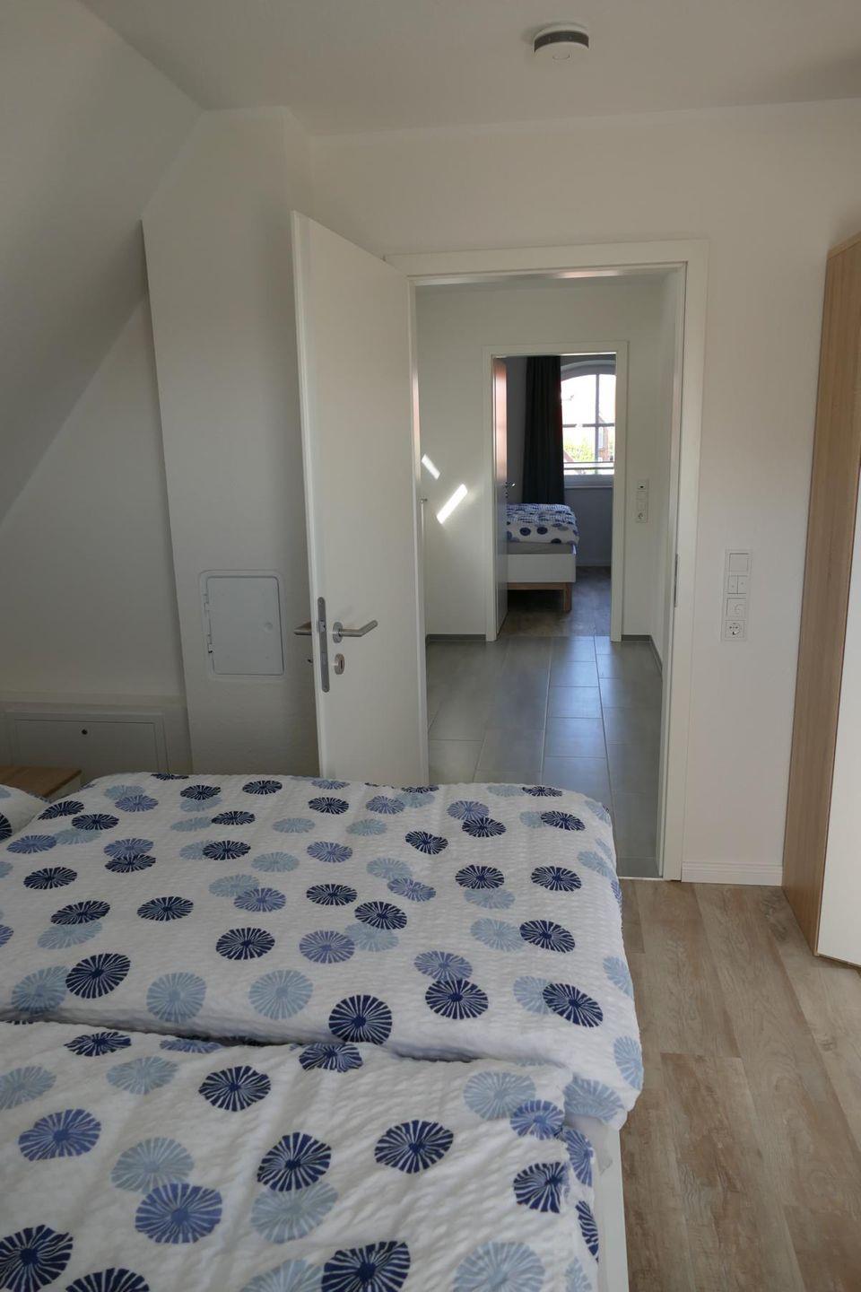 Im Obergeschoss sind zwei gemütliche Schlafzimmer (beide mit Doppelbett und Kleiderschrank) sowie ein weiteres Badezimmer mit Dusche, Babybadewanne, Wickelauflage, Waschmaschine und Trockner.