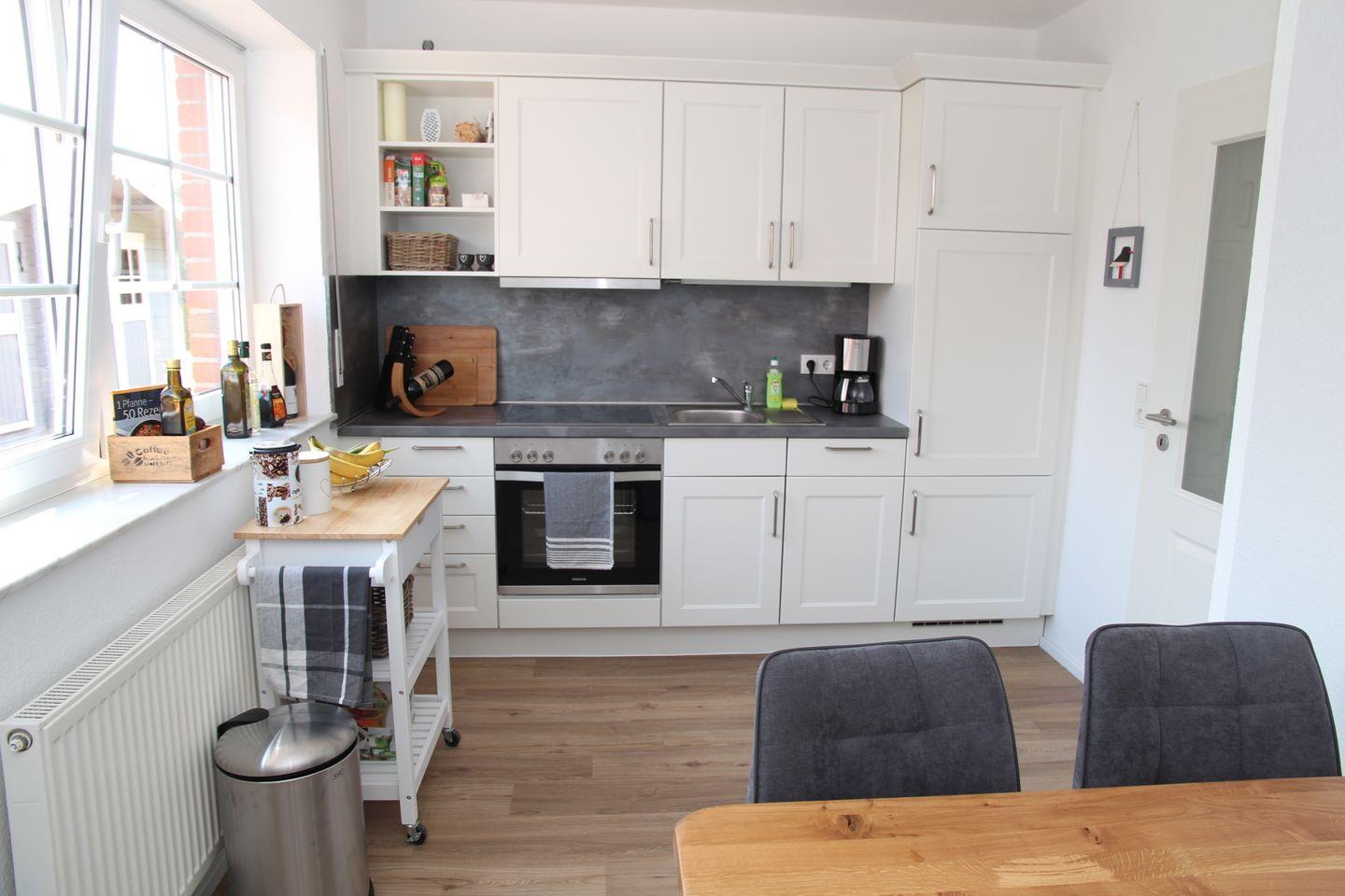 Die moderne Küche (neu in 2025) ist ausgestattet mit einem Essplatz für 4 Personen, Backofen, Ceran-Kochfeld, Kühlschrank mit Gefrierfach, Geschirrspülmaschine, Wasserkocher, Eierkocher und Kaffeemaschine (Melitta). Zudem finden Sie an der Pinnwand viele interessante Ausgehmöglichkeiten, Aktivitäten und Informationen (z. B. Fährfahrten) rund um Greetsiel.