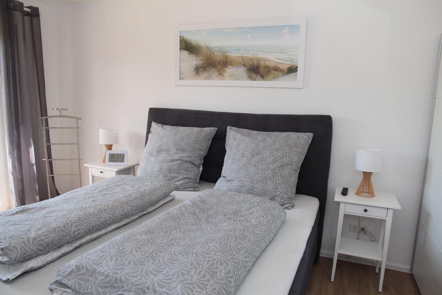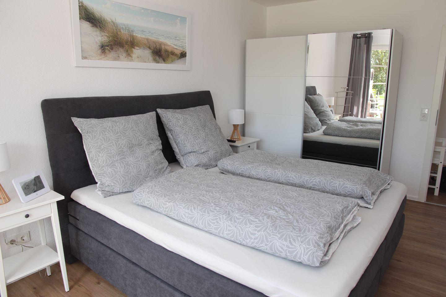 Das Schlafzimmer verfügt über ein hochwertiges Doppel-Boxspringbett, Kleiderschrank und TV.
