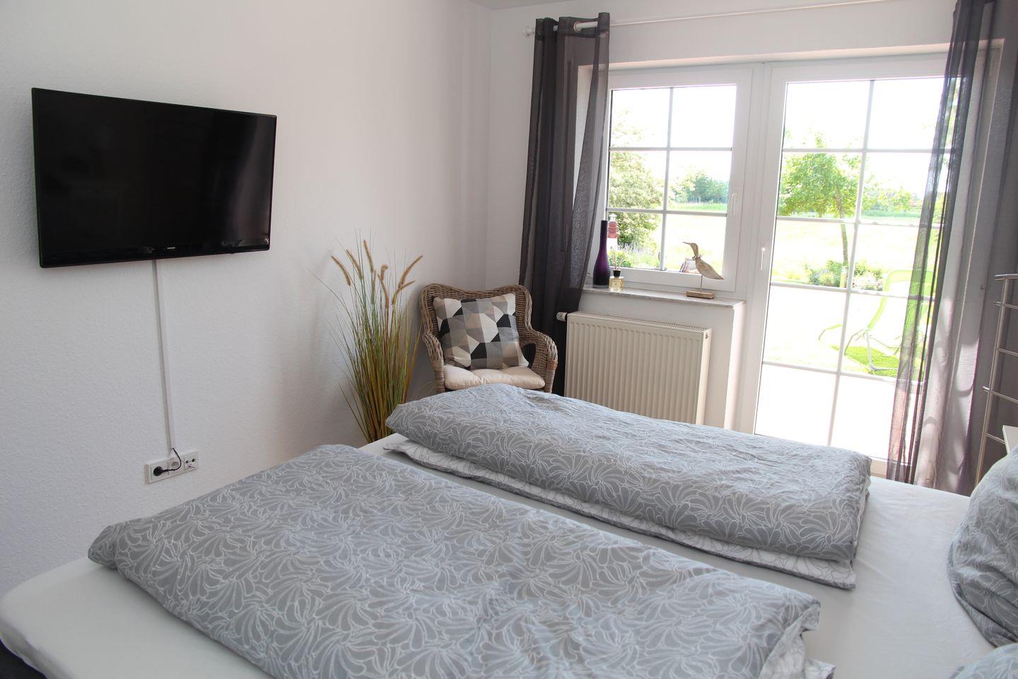 Für gemütliche Abende sorgt die möblierte Terrasse (begehbar von Schlaf- und Wohnzimmer). Hier können Sie den ganzen Tag ungestört und in völliger Ruhe die Sonne genießen. Ein Grillkamin, eine gemütliche Essecke und Sonnenliegen stehen zur Verfügung sowie ein sehr schön angelegter Garten mit Blick über die dahinterliegenden Felder bis hin zum Deich.