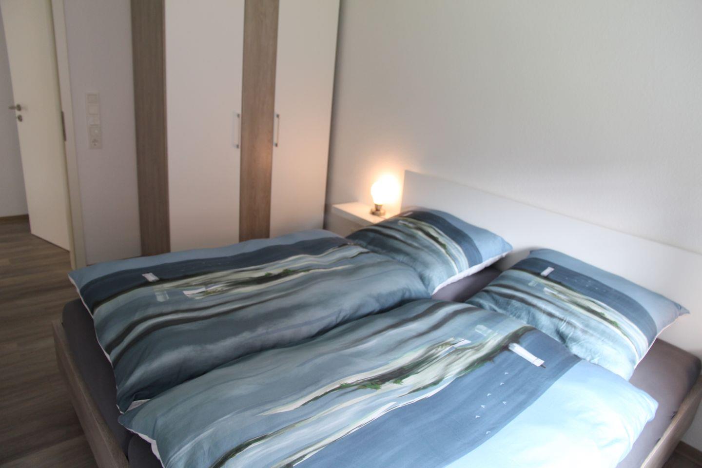 Die Ferienwohnung Sonne und Meer im Erdgeschoss ist geschmackvoll und modern eingerichtet. Sie verfügt über zwei Schlafzimmer, wovon eines mit einem Doppelbett und das andere mit zwei Einzelbetten ausgestattet ist. Beide Schlafräume lassen sich mit elektrischen Außenjalousien abdunkeln. In dem 2. Schlafzimmer befindet sich ein Fernsehgerät.
