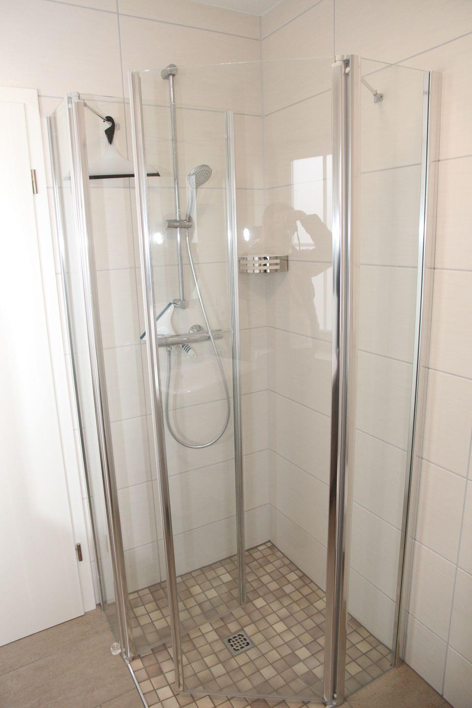 Das Badezimmer mit ebenerdiger Dusche, Toilette und Föhn befindet sich direkt neben dem Gäste-WC.
