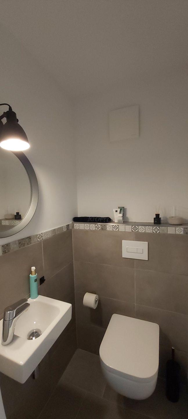 Rechts vom Eingang befindet sich ein separates Gäste-WC, daneben finden Sie ein Duschbad mit bodentiefer Dusche, Föhn und Fenster. Es folgt ein Schlafzimmer mit zwei separaten Betten, diese können aber auch zusammen gestellt werden. Ein großzügiger Schrank und ein an der Wand hängender Fernseher komplettieren das Zimmer. Für ein Bett ist ein Bettschutzgitter vorhanden, ein Hochstuhl steht ebenfalls für die kleinen Gäste bereit.