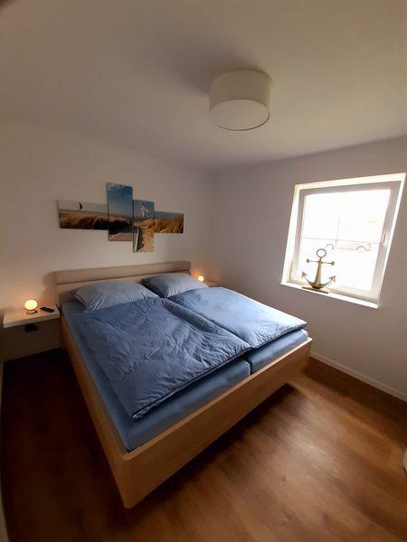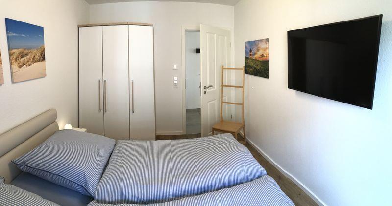 Die Ferienwohnung verfügt über zwei Schlafzimmer, die beide mit einem Doppelbett (1,80 x 2,00 m), einem vollwertigen Kleiderschrank, zusätzlichen Ablagemöglichkeiten und einem Fernseher (Smart-TV) ausgestattet sind. Beide Schlafräume lassen sich ebenfalls durch elektrische Außenjalousien abdunkeln.