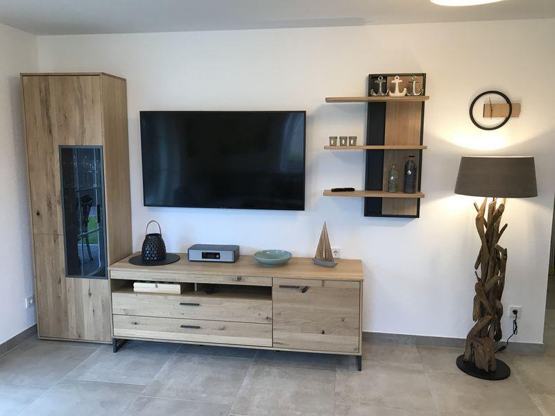 Das Wohnzimmer bietet eine gemütliche und bequeme Eckcouch und einen großen Fernseher (Smart-TV). Das vorhandene Radio ist mit DAB +, einer Bluetooth-Schnittstelle zur Nutzung von Streaming-Diensten über das eigene Smartphone sowie einer WLAN-Schnittstelle zum Empfang von Internet-Radio ausgestattet. Eine umfassende Spiele- und Büchersammlung (u. a. Ostfriesenkrimis) verspricht entspannte Stunden in der Wohnung.
