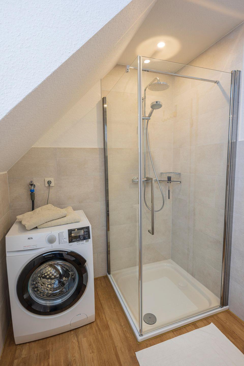 Ebenfalls auf dieser Etage befindet sich ein Schlafzimmer mit Doppelbett, Fernseher und Kleiderschrank, sowie das Duschbad mit Verstaumöglichkeiten, Waschmaschine, Handtuchheizkörper und Föhn.