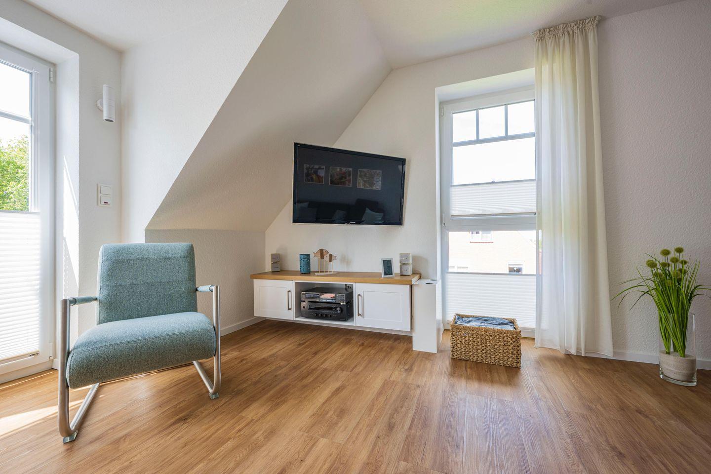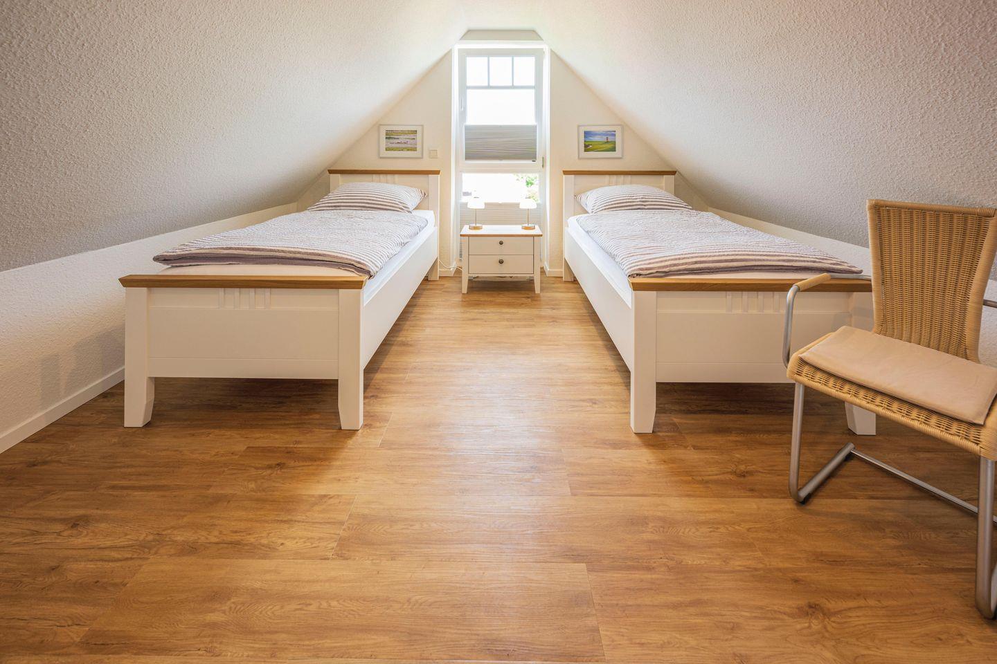 Im Dachgeschoss erwartet Sie hinter einer verschließbaren Tür ein weiteres Schlafzimmer mit Kommode und weiterem Fernseher. Von hier haben Sie auch einen tollen Blick über die Felder bis hin zum Deich!