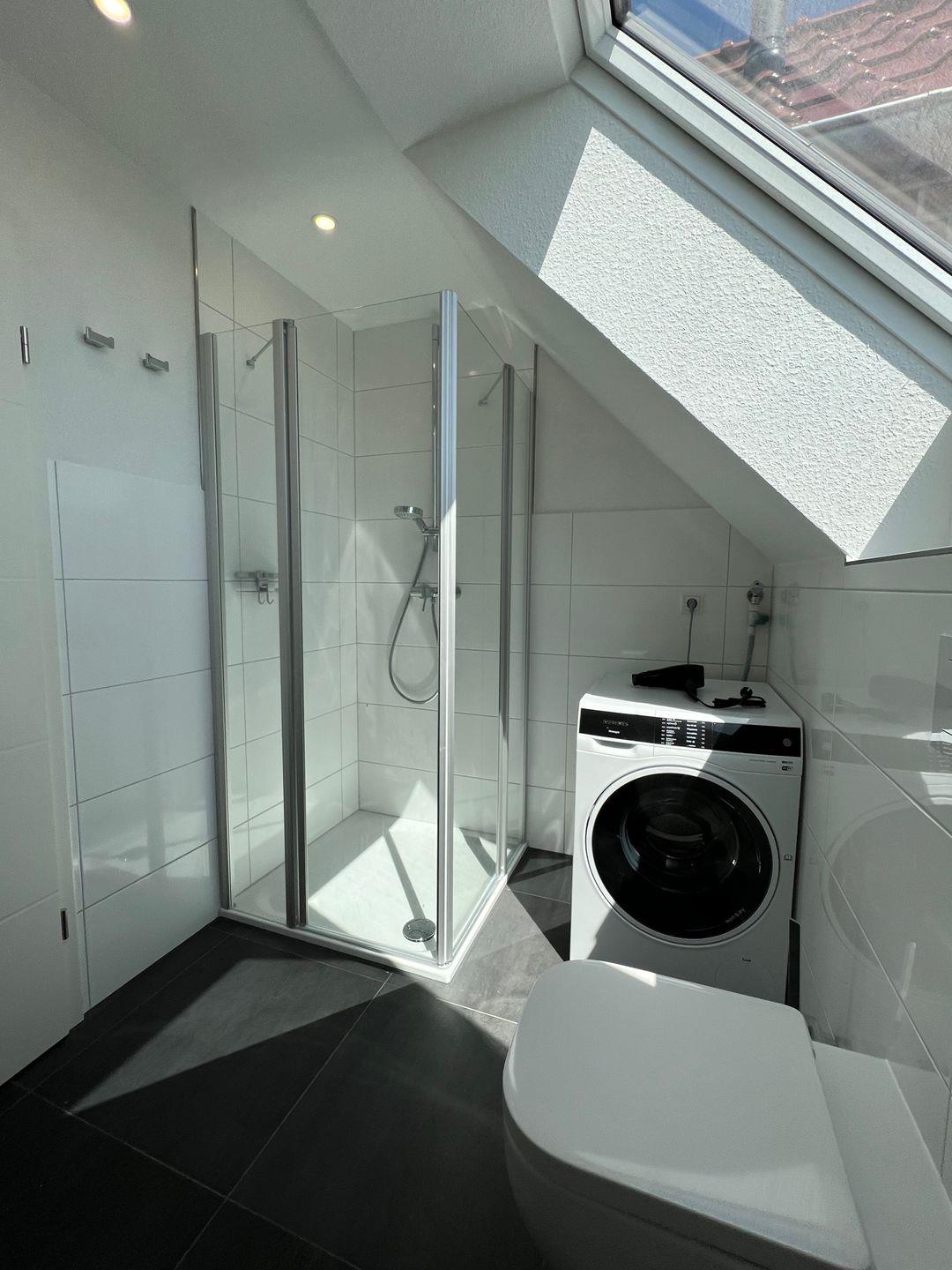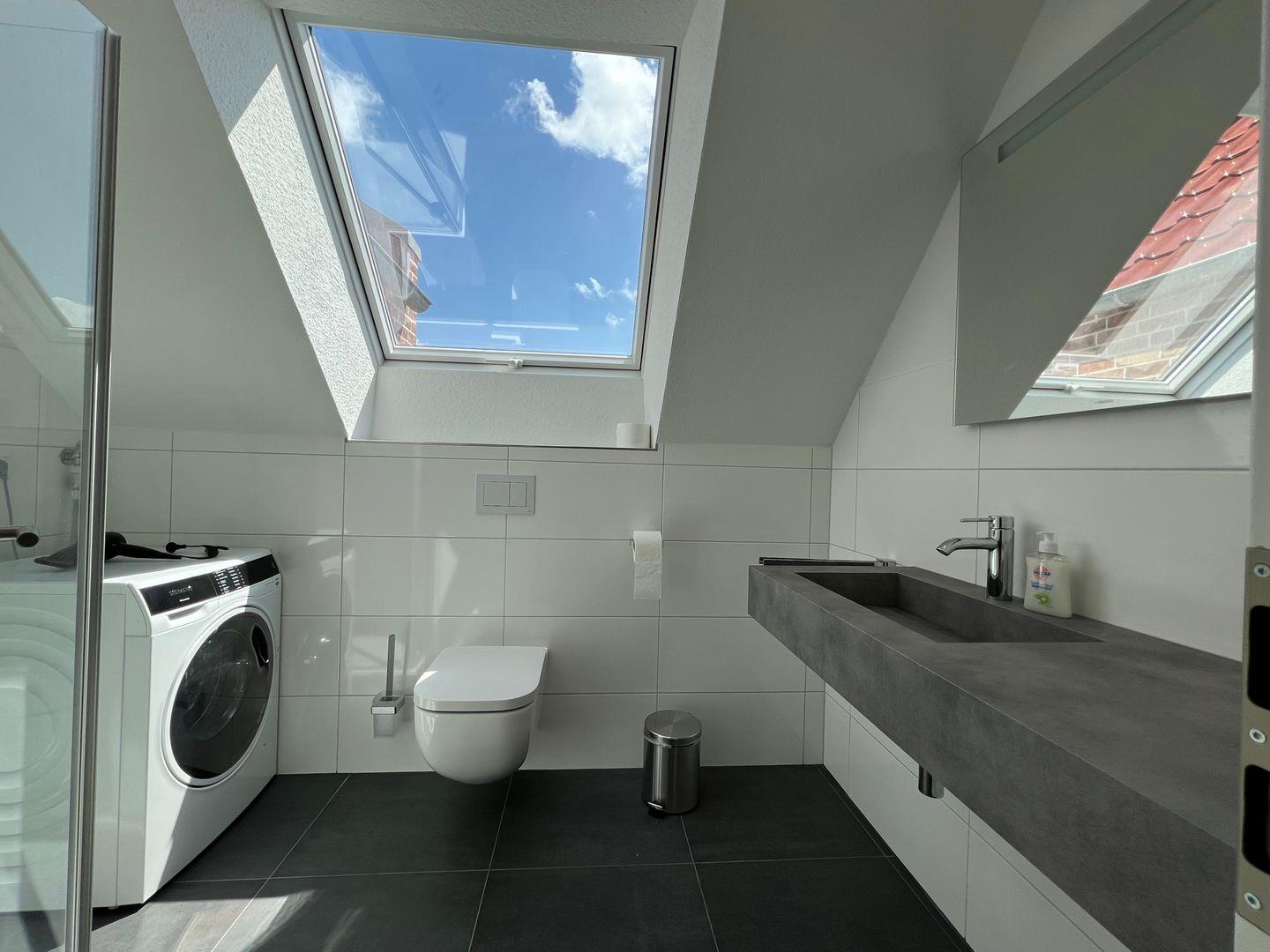 Auf der gleichen Etage finden Sie auch ein Schlafzimmer mit Doppelbett, Kleiderschrank, Fernseher und elektrischen Außenrollläden, sowie das geräumige Duschbad mit großem Waschtisch, ebenerdiger Dusche, Föhn und Waschtrockner.