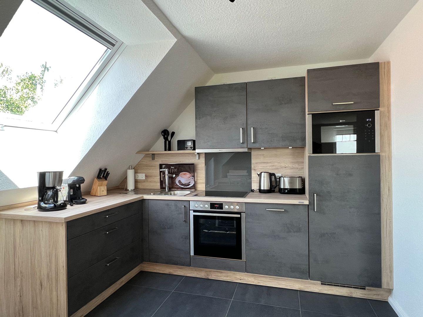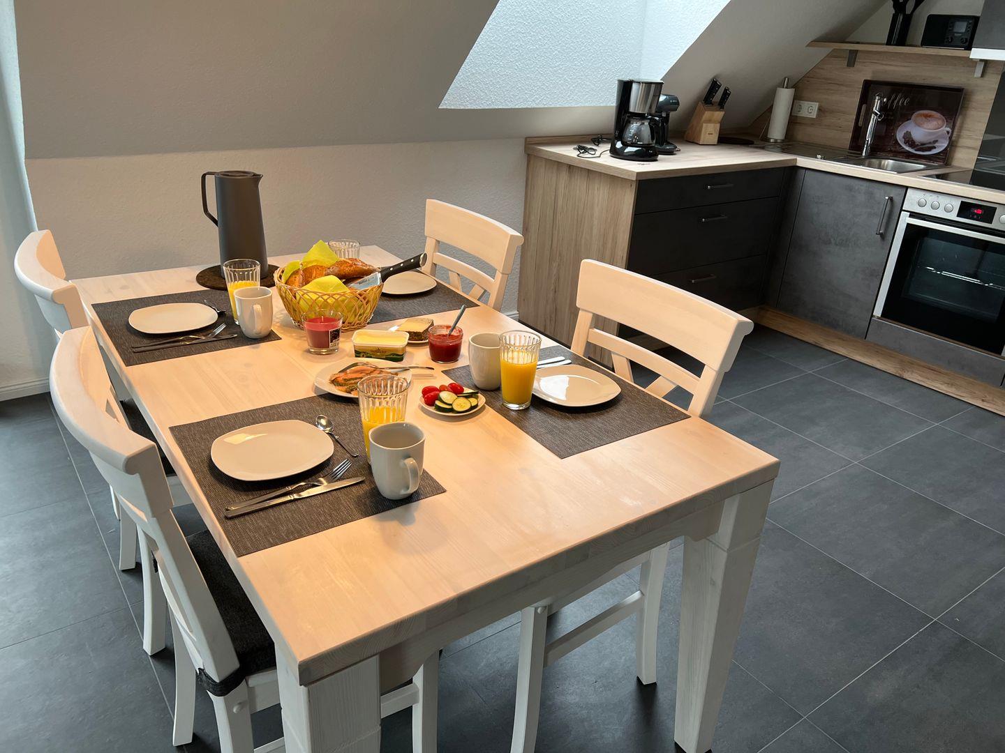 Angrenzend befindet sich der Esstisch mit vier Stühlen, sowie die vollwertig ausgestattete Küche. Hier befinden sich alle wichtigen Helferlein: Kühlschrank mit Gefrierfach, Backofen, Ceran-Kochfeld, Mikrowelle, Kaffeemaschine, Bosch-Kapselmaschine, Toaster, Wasserkocher, Radio etc.