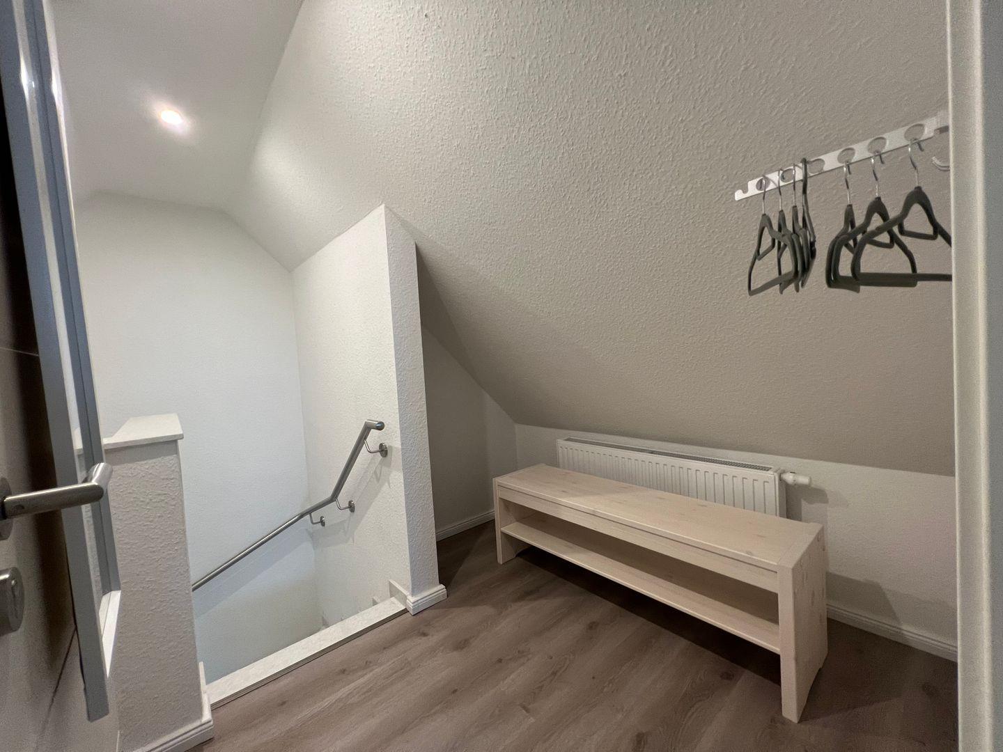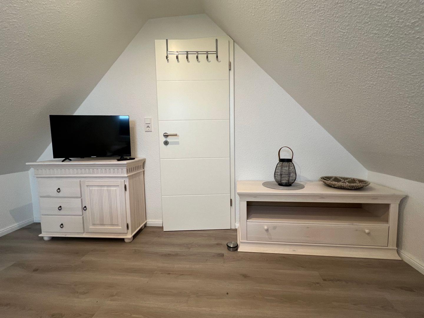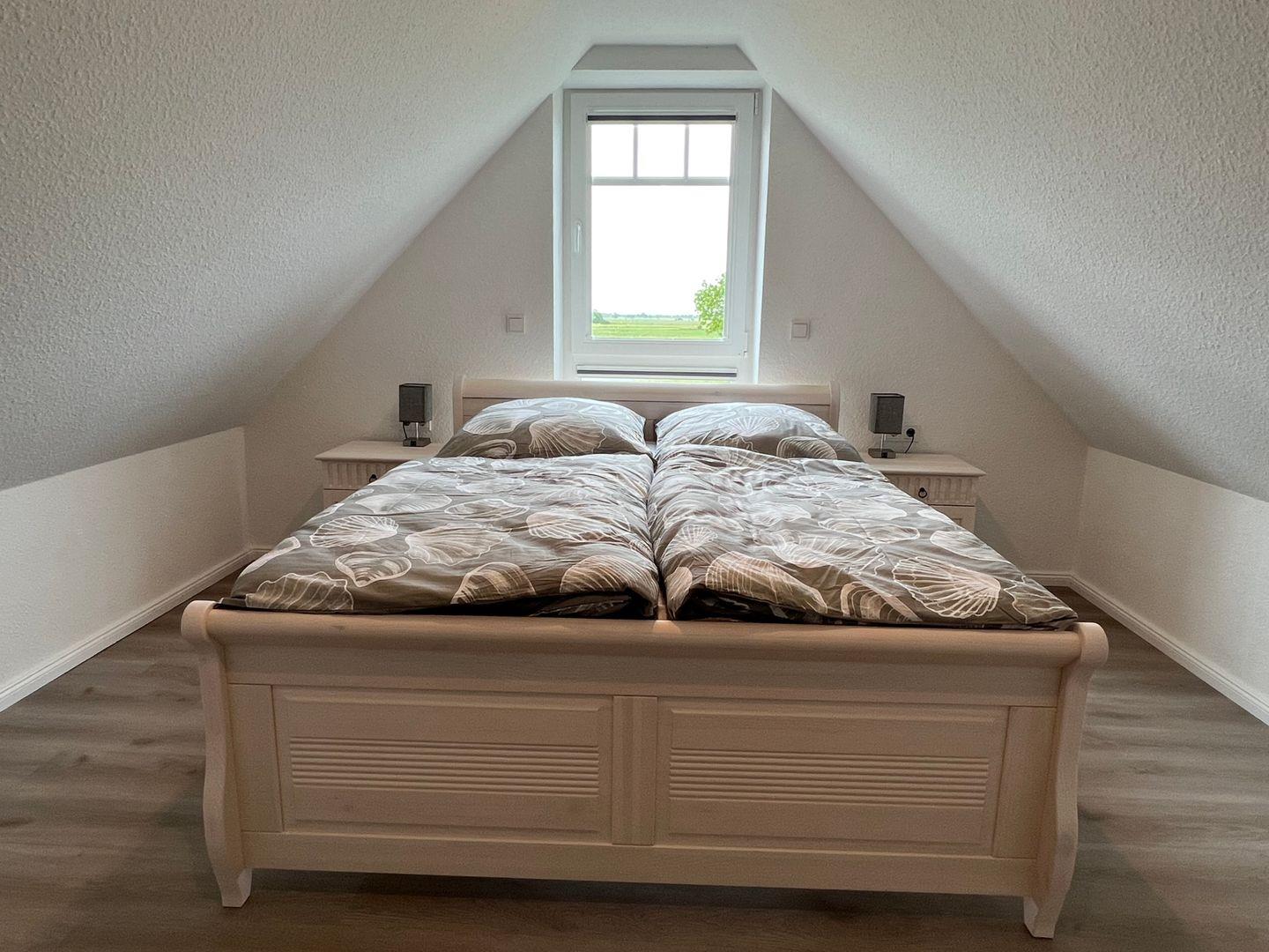 Das zweite Schlafzimmer finden Sie im ausgebauten Dachgeschoss mit 160cm breitem Doppelbett, Kommode und Fernseher.