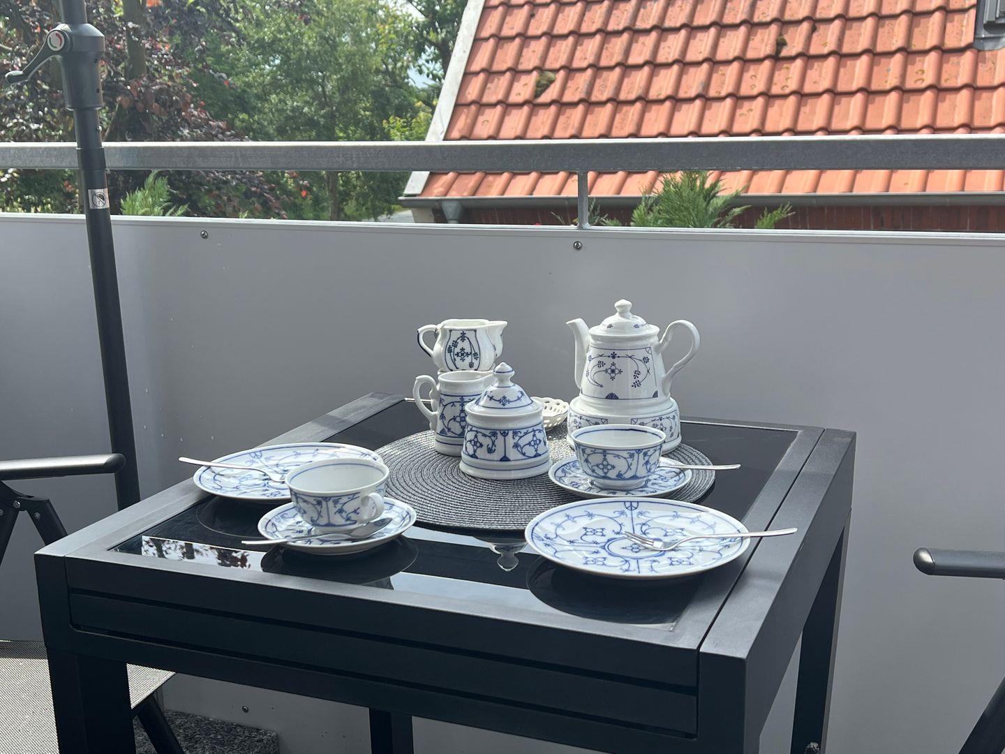Im großzügigen Wohnbereich können Sie ein gemütliches L-Sofa und einen großen Fernseher vorfinden. Von hier haben Sie auch einen schönen Blick in südlicher Richtung über die Felder in der näheren Umgebung, den Sie auch vom möblierten West-Balkon mit Sonnenschirm aus genießen können.