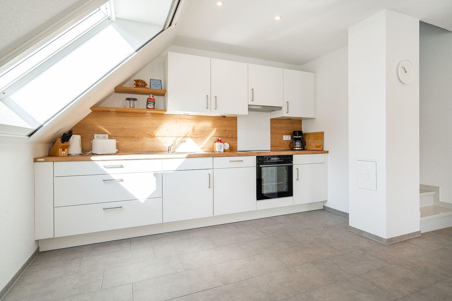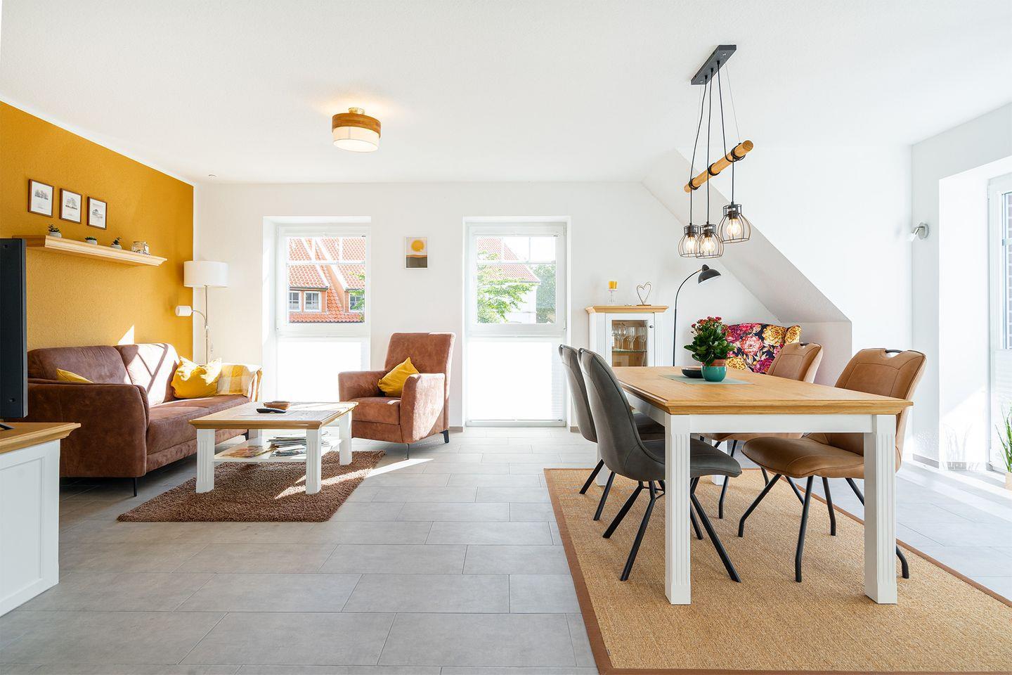 Treten Sie ein in den großen Wohn-Essbereich mit gut ausgestatteter Küchenzeile (u.a. Cerankochfeld, Backofen, Kühlschrank mit Gefrierfach, Spülmaschine, Kaffeemaschine, Toaster, Wasserkocher). Weiterhin finden Sie einen Esstisch mit vier gemütlichen Stühlen und das Sofa mit zwei Sesseln und großem Fernseher. Von hier aus können Sie auch auf den möblierten Balkon hinaustreten.
