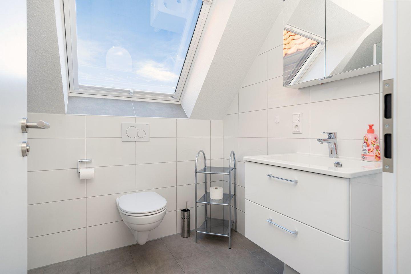 Ebenfalls auf dieser Etage finden Sie ein Schlafzimmer mit Doppelbett, Kleiderschrank und Fernseher, sowie das Duschbad mit Fön, Waschtrockner und ebenerdiger Dusche.