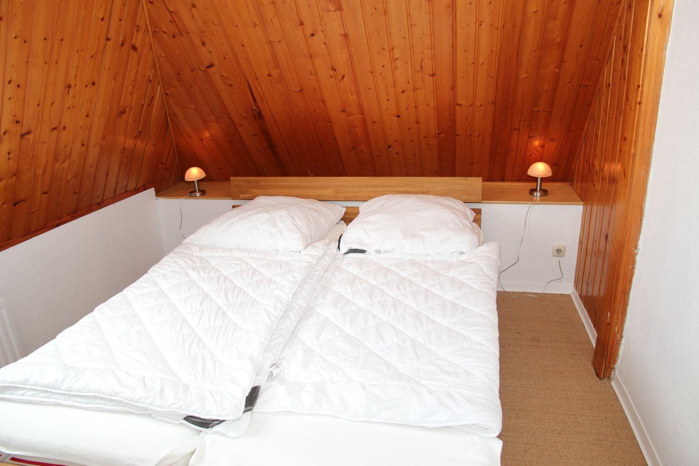 Das Schlafzimmer verfügt über ein Doppelbett mit Kleiderschrank und räumlich abgetrennt die Dusche. Das WC mit Waschbecken ist separat vom Flur erreichbar