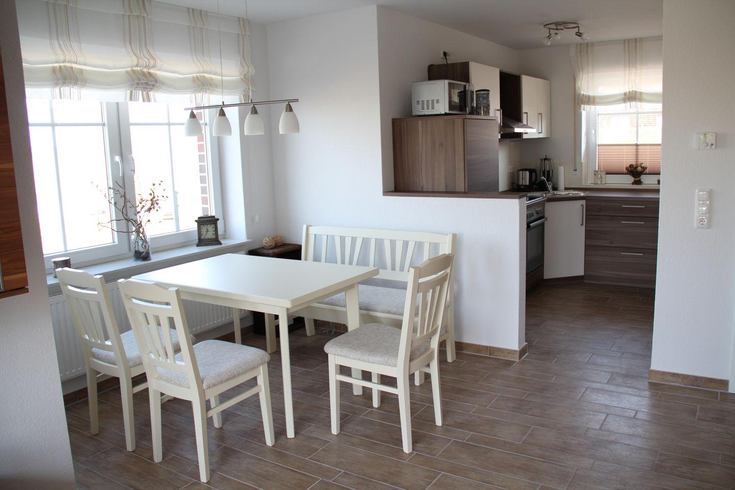 Die moderne Doppelhaushälfte bietet Platz für bis zu 4 Personen mit Hund! Treten Sie herein ins Haus Buttje! Vom Flur aus gelangen Sie in den großzügigen Wohn-/Essbereich. Entspannen Sie sich im Wohnbereich mit einer gemütliche Couchgarnitur, einem Relaxsessel, einen Flachbild-TV und einer Musikanlage. Von hier können Sie durch die Terrassentür in den Garten blicken. Die helle Essecke am Fenster lädt zu Klönabenden oder gemeinsame Essen ein. Die offen gestaltete Küche ist voll ausgestattet und bietet u. a. neben einer Spülmaschine auch eine Mikrowelle. Im EG befindet sich auch das helle Gäste-WC und der Abstellraum mit Waschmaschine und Trockner. Auf der ersten Etage liegt das helle Bad mit Dusche und WC. Träumen Sie in den 2 Schlafzimmern: eines mit einem Doppelbett und eines mit 2 Einzelbetten. Außenrollos sind vorhanden. Im Dachgeschoss bietet das Haus als I-Tüpfelchen einen zusätzlichen Raum mit TV und Couch, der zum Relaxen einlädt. Von hier haben Sie einen schönen Ausblick auf die Deichlandschaft. Die möblierte Terrasse lädt zum Relaxen und frische Luft schnappen ein. WLAN ist verfügbar. Ein Parkplatz befindet sich vor dem Haus. Ihr Hund ist herzlich willkommen! Der Garten ist eingezäunt (z.T. mit Hecken und Sträuchern).