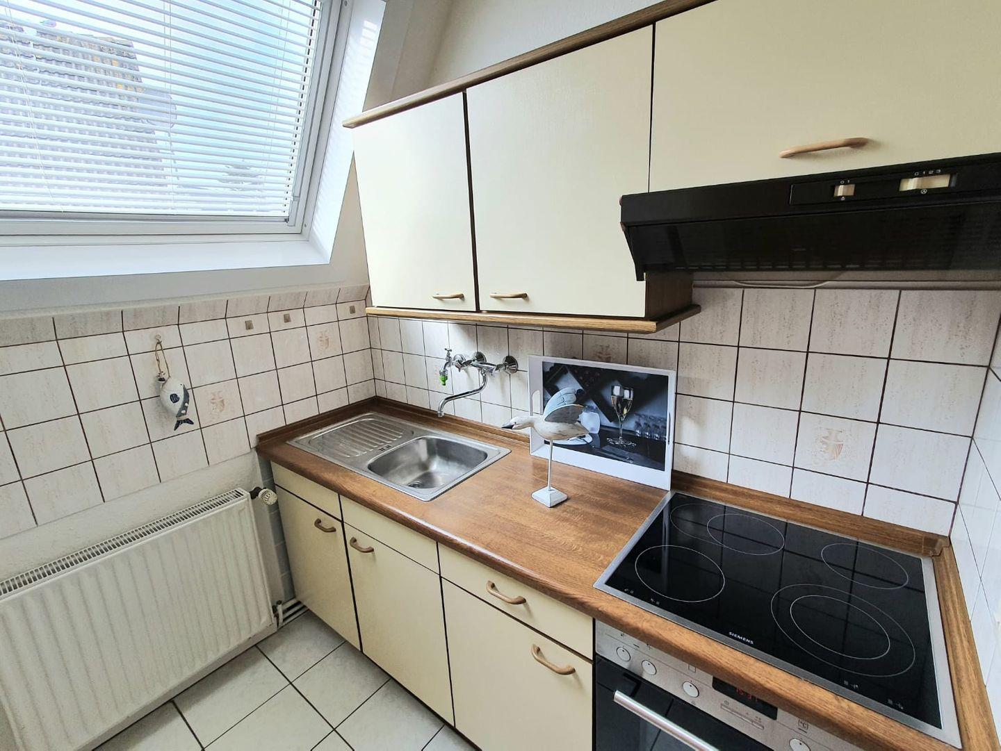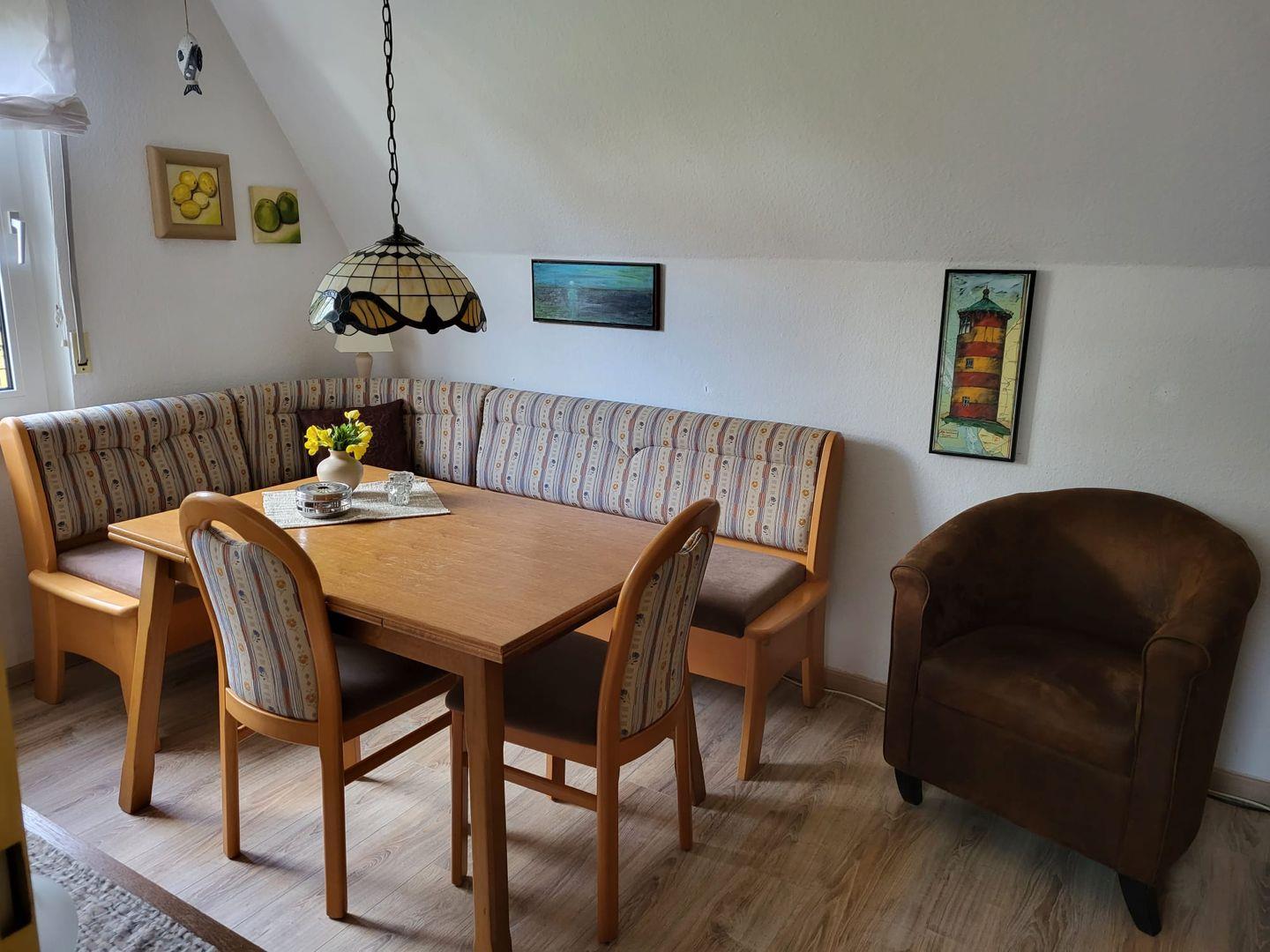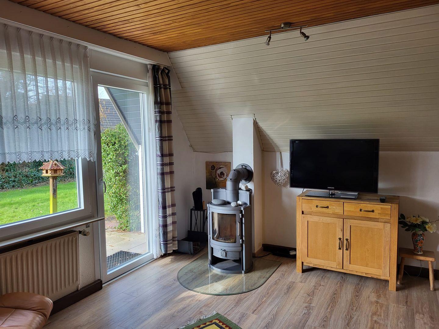 Das Ferienhaus Friesia ist ein Nurdachhaus mit großem Grundstück und liegt in einer ruhigen Sackgassenlage Greetsiels in Deichnähe. Kommen Sie herein! Gleich neben der Haustür befindet sich das Duschbad mit WC, das hell gefliest ist. Der Flur führt Sie in die separate Küche, die komplett eingerichtet ist. Mikrowelle, Kaffeemaschine und Toaster sind vorhanden. Hier können Sie Ihre Speisen zubereiten und dann gegenüber im Esszimmer servieren. Die gemütliche Eckbank lädt ebenfalls zum Klönen und Verweilen ein. Im ganzen Haus hat sich die Eigentümerin mit schönen selbst gemalten Bildern verwirklicht. Geradeaus geht es in den großzügigen Wohnbereich mit Couchgarnitur und Flachbild-TV. Ein Kaminofen im Raum sorgt für ein gemütliches Ambiente. Die große Fensterfront lässt auf die Terrasse blicken. Dort genießt man die frische Luft und die Sonnenstrahlen. Eine etwas steile Raumspartreppe führt nach oben zu 2 Schlafräumen und zum separaten WC. Das erste Schlafzimmer verfügt über ein Doppelbett sowie eine Waschgelegenheit. Gegenüber gelangen Sie in das 2. Schlafzimmer mit 2 Einzelbetten. Die Fenster im unteren Bereich sind mit Außenrollos ausgestattet. Ein Gartenhäuschen steht zum Abstellen von Fahrrädern usw. zur Verfügung. Das Haus Friesia ist ein Nichtraucherhaus! WLAN ist verfügbar!