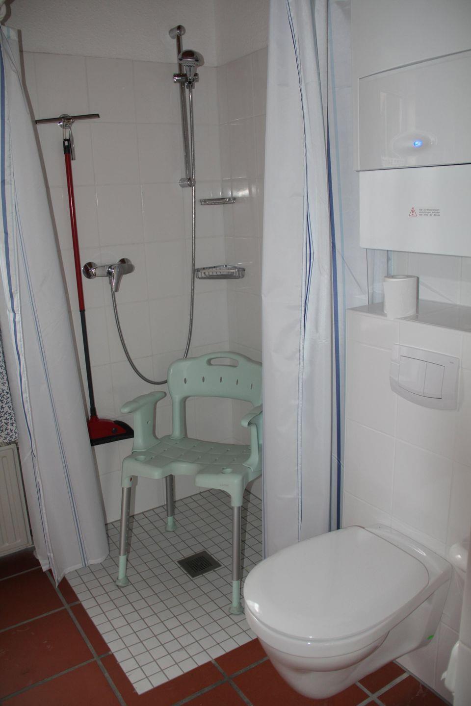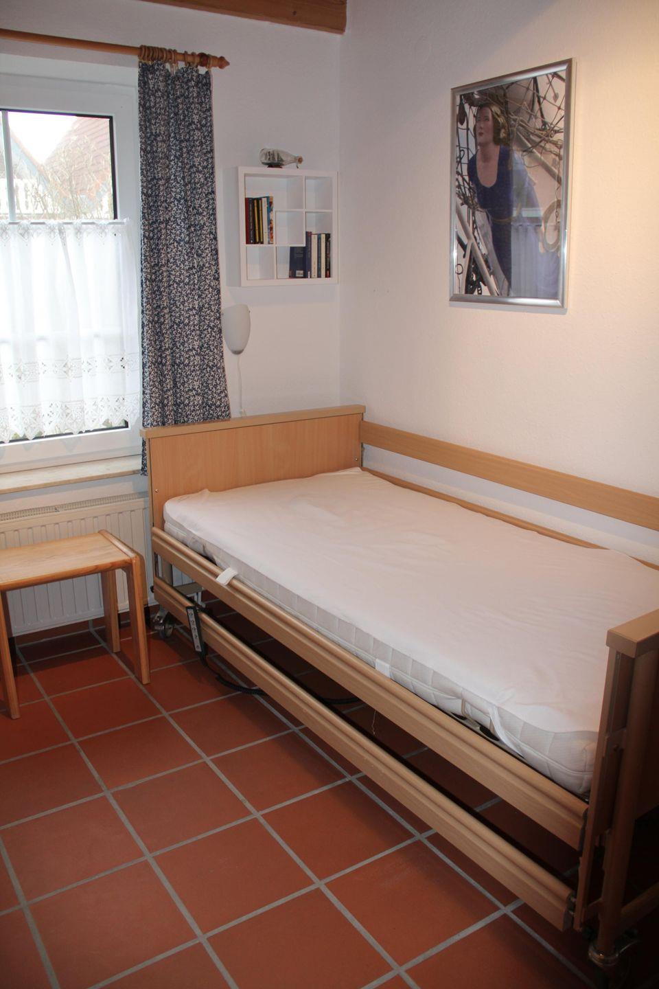Kommen Sie herein in das gemütlich eingerichtete Friesenhaus! Vom Flur gelangen Sie in ein barrierefreies Badezimmer mit Dusche/WC und Waschmaschine + Trockner. Das angrenzende Schlafzimmer ist mit einem Pflegebett ausgestattet. Das Bett erfüllt die Erwartungen, die eine pflege- oder hilfsbedürfige Person benötigt und erleichtert der Familie die Pflege. Außerdem kann ein Schrankbett ausgeklappt werden, hier befindet sich ein weiterer Schlafplatz.
