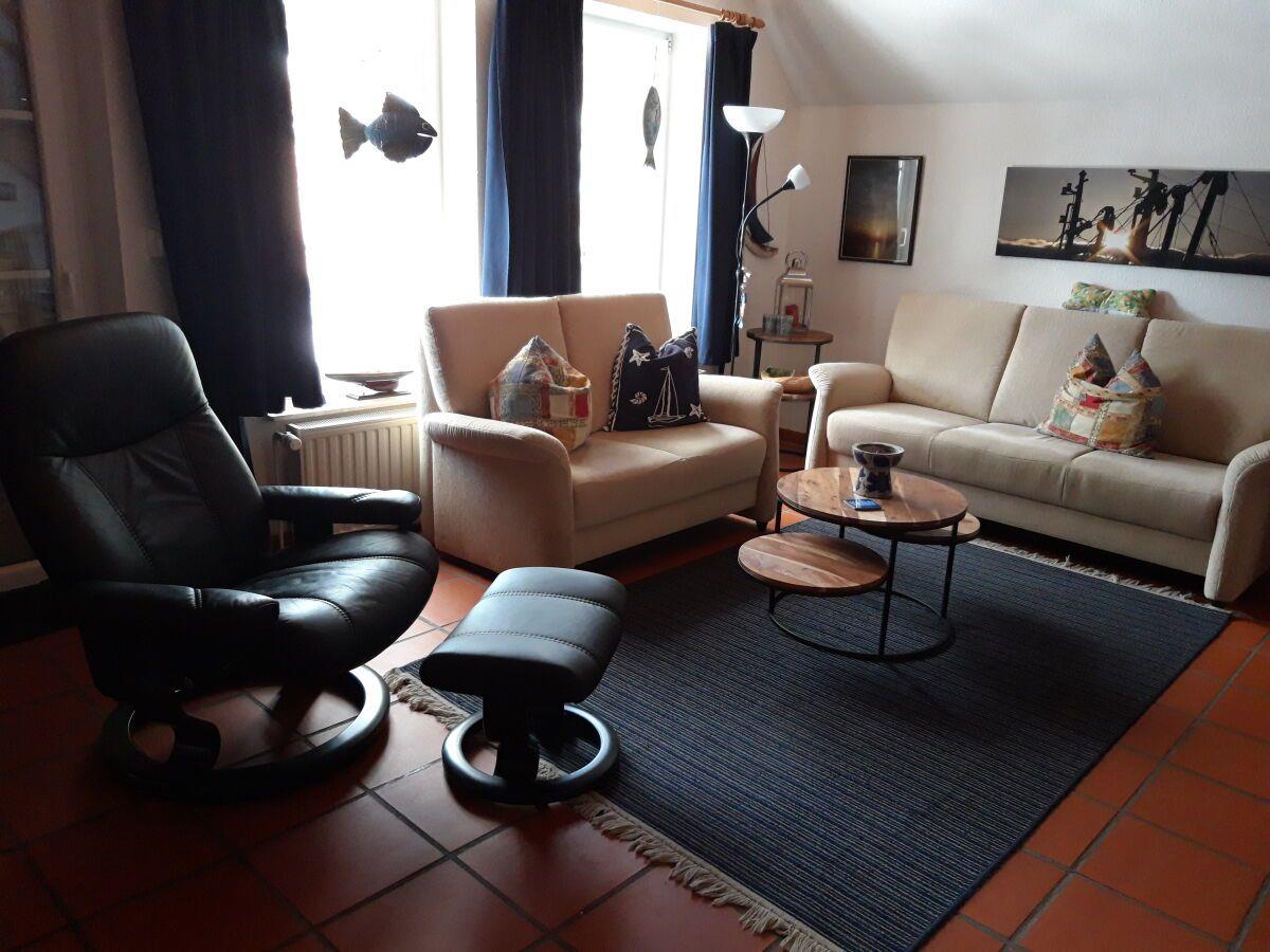 Des Weiteren liegt im EG eine vollausgestattete Küche mit gemütlichem Essbereich im ostfriesischen Stil. Der Wohnbereich mit Blick in den Garten lädt zum Entspannen und Verweilen ein. Von hier aus haben Sie Zugang zur schönen Sommerterrasse. Genießen Sie die frische Nordseeluft!