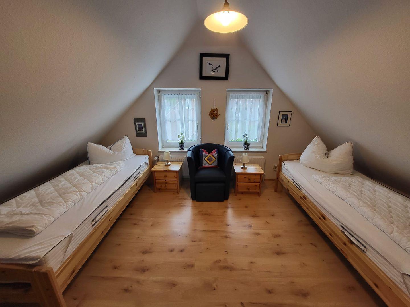 Im Obergeschoss finden Sie ein Schlafzimmer mit einem Doppelbett (+Babybett), sowie ein Schlafzimmer mit zwei Einzelbetten und ein zusätzliches Gäste-WC. Außenrollos in den Schlafräumen sorgen für ruhige Nächte. Beide Räume sind mit Einbaukleiderschränken ausgestattet. WLAN ist verfügbar! 2 Parkplätze stehen am Haus zur Verfügung.