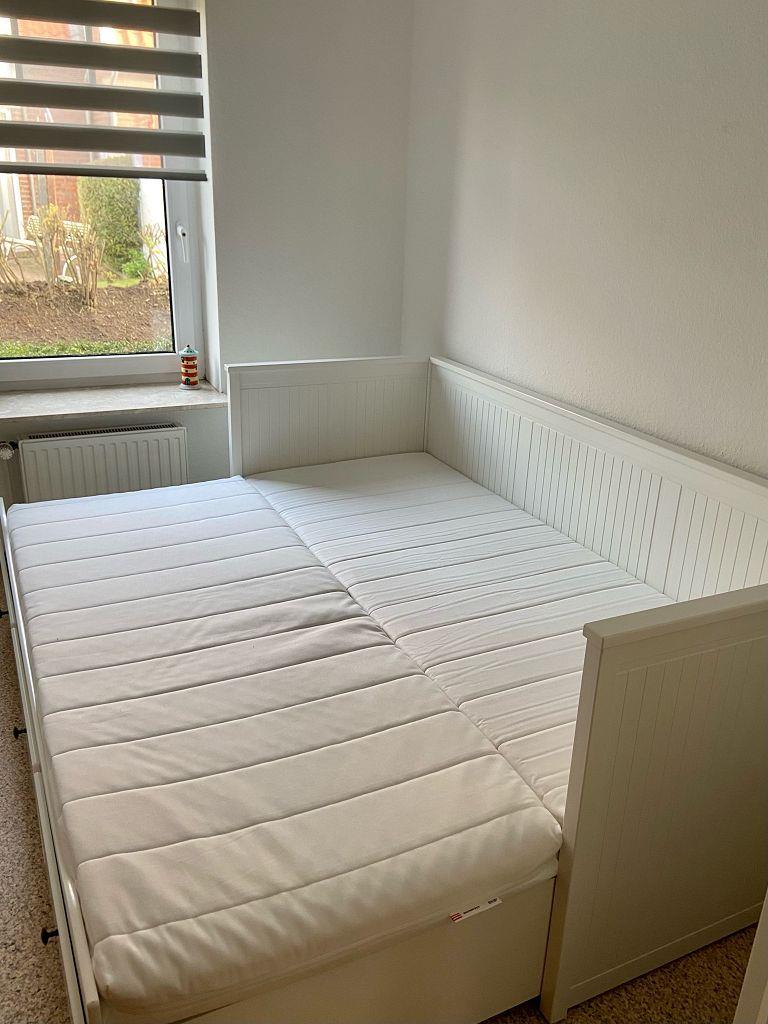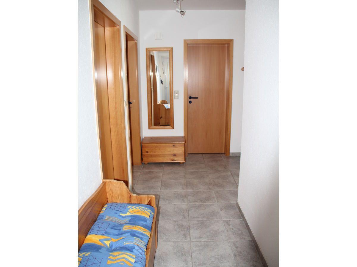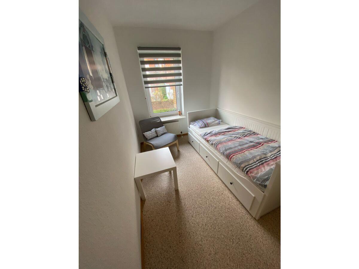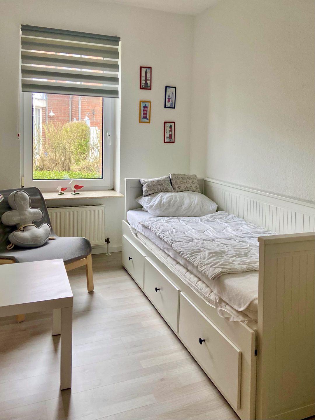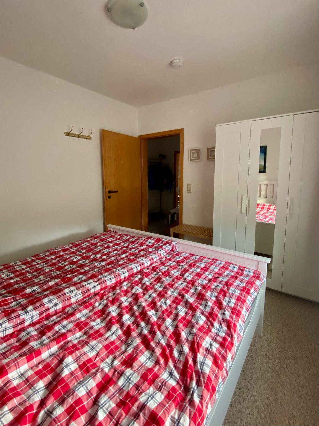 Die Wohnung verfügt über ein Schlafzimmer mit Doppelbett. Das zweite helle Schlafzimmer hat ein Einzelbett, das bei Bedarf zu einem Doppelbett umfunktioniert werden kann. Das Badezimmer beinhaltet eine Dusche und ein WC. Sie haben alle Räume auf einer Etage, so dass sich auch Personen mit Gehbehinderung (Rollator) gut in der Wohnung bewegen können. Nur die Duschwanne hat einen kleinen Einstieg. Vom Wohnbereich gelangen Sie auf die Sonnenterrasse, die mit gemütlichen Gartenmöbeln ausgestattet ist. Ein Schuppen für mitgebrachte Fahrräder steht zur Verfügung. WLAN ist vorhanden. Der Parkplatz befindet sich gegenüber des Hauses (Parkplatz Nr. 7).