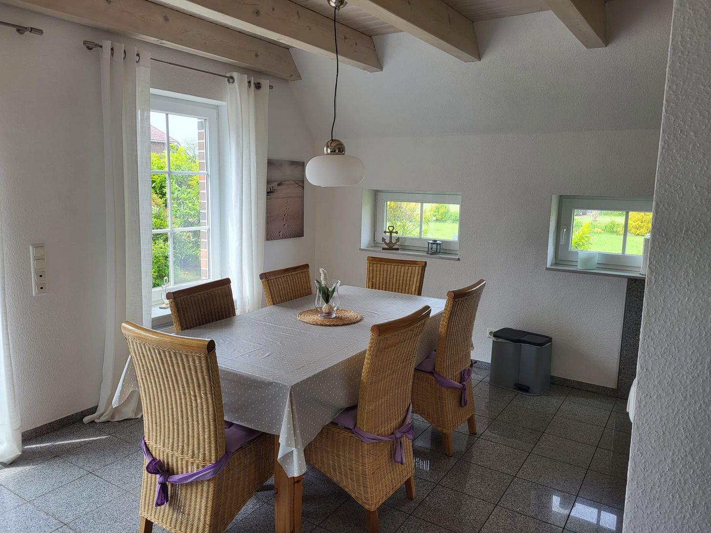 Das Ferienhaus "Spirling" bietet Ihnen und Ihrer Familie viel Platz für bis zu 6 Personen. Im Erdgeschoss finden Sie den hellen modernen Wohn- und Essbereich, von dem aus Sie Zugang zur großen Terrasse und zum Garten haben. Die Ledercouch ist sehr gemütlich. Hier kann man ruhige entspannte Stunden genießen. Ein Flachbild-TV ist vorhanden. Die Küchenzeile ist mit Geschirrspüler und Ceranfeld ausgestattet. Angrenzend steht der Esstisch für 6 Personen. Des Weiteren befindet sich im Erdgeschoss ein Schlafzimmer mit Doppelbett und ein helles Bad mit Dusche und Fußbodenheizung. Ein Abstellraum mit Waschmaschine und Wäschetrockner stehen ebenfalls im unteren Bereich zur Verfügung. Das Obergeschoss bietet Ihnen zwei großzügige helle Schlafzimmer, eines mit Doppelbett und das andere mit 2 Einzelbetten. Hier befindet sich auch das zweite Duschbad. Die möblierte Terrasse mit Strandkorb lädt zum Relaxen und frische Nordseeluft schnuppern ein.