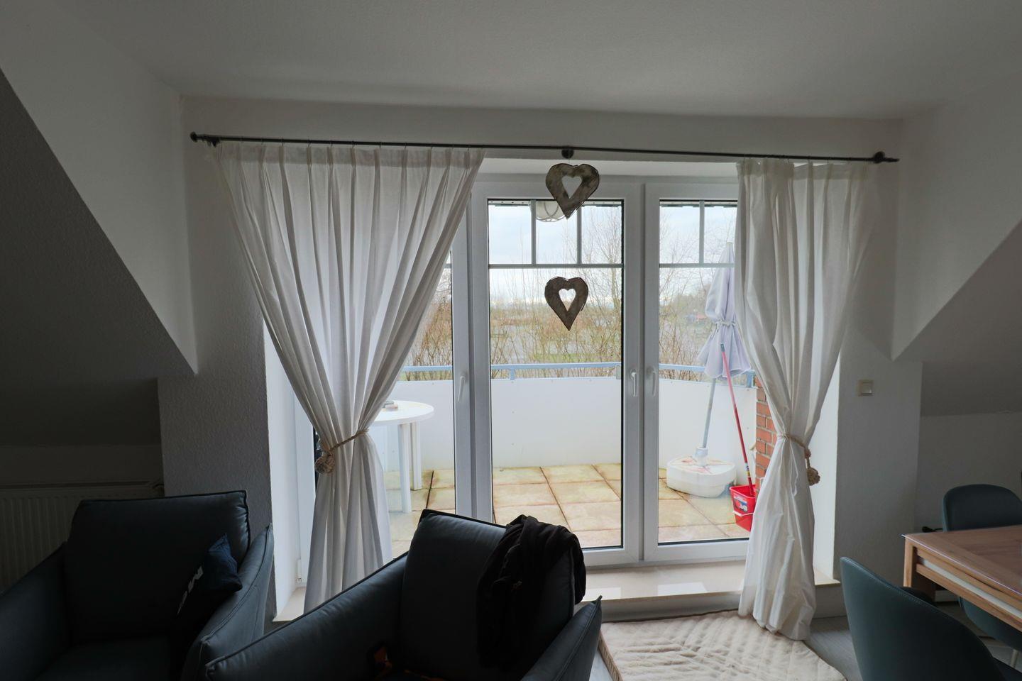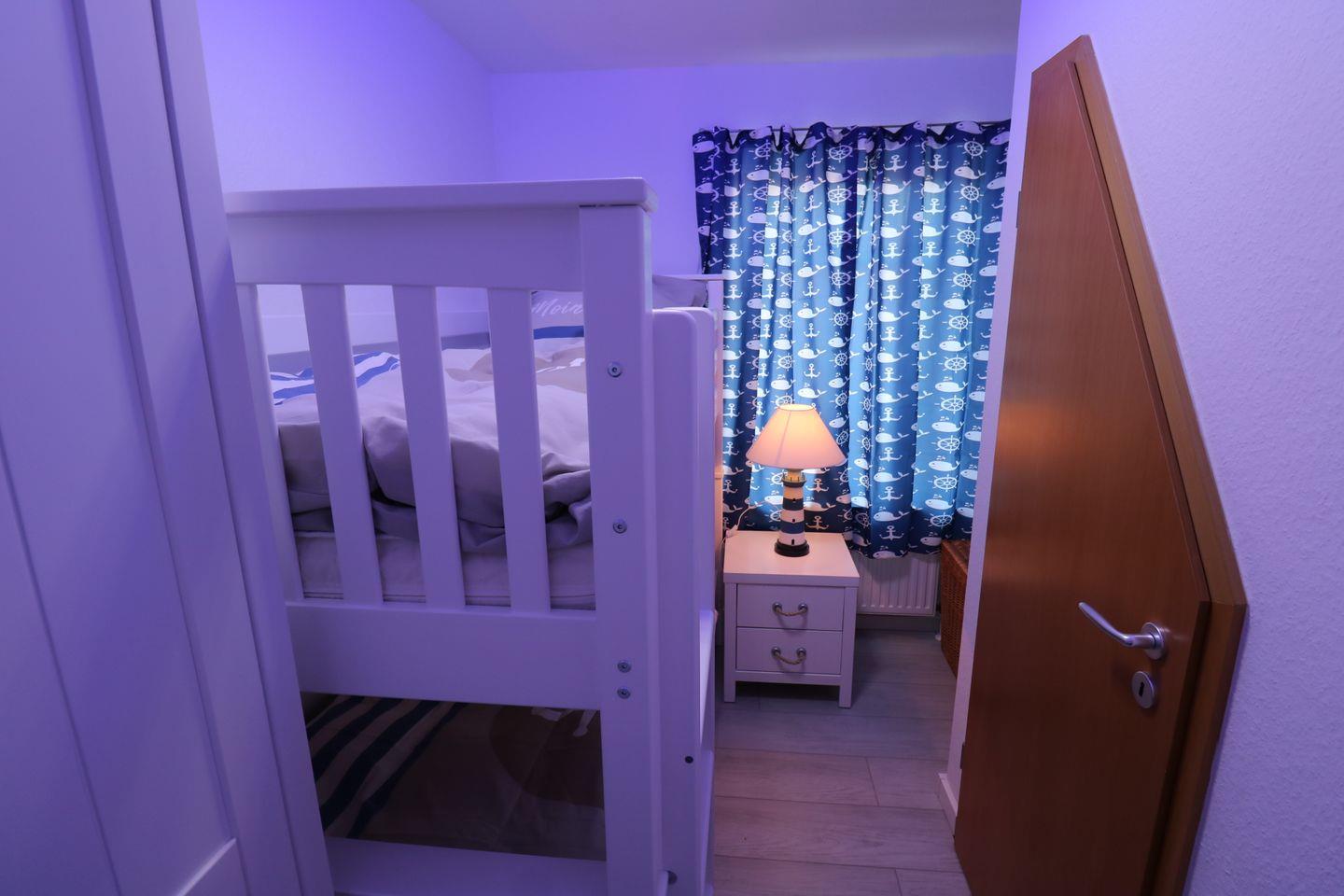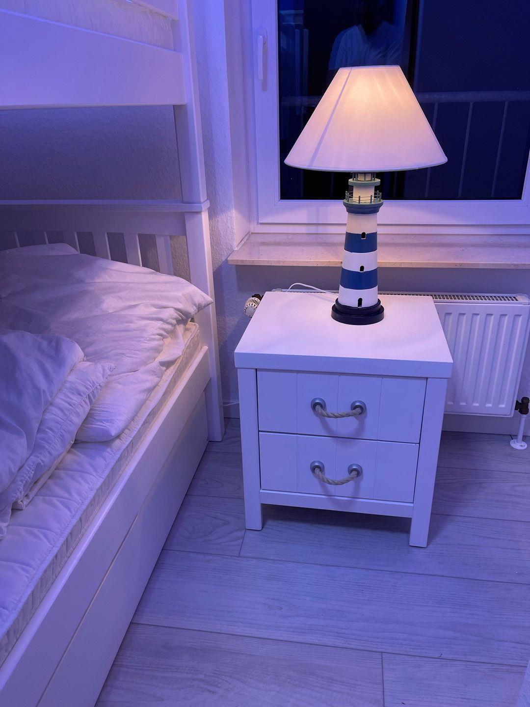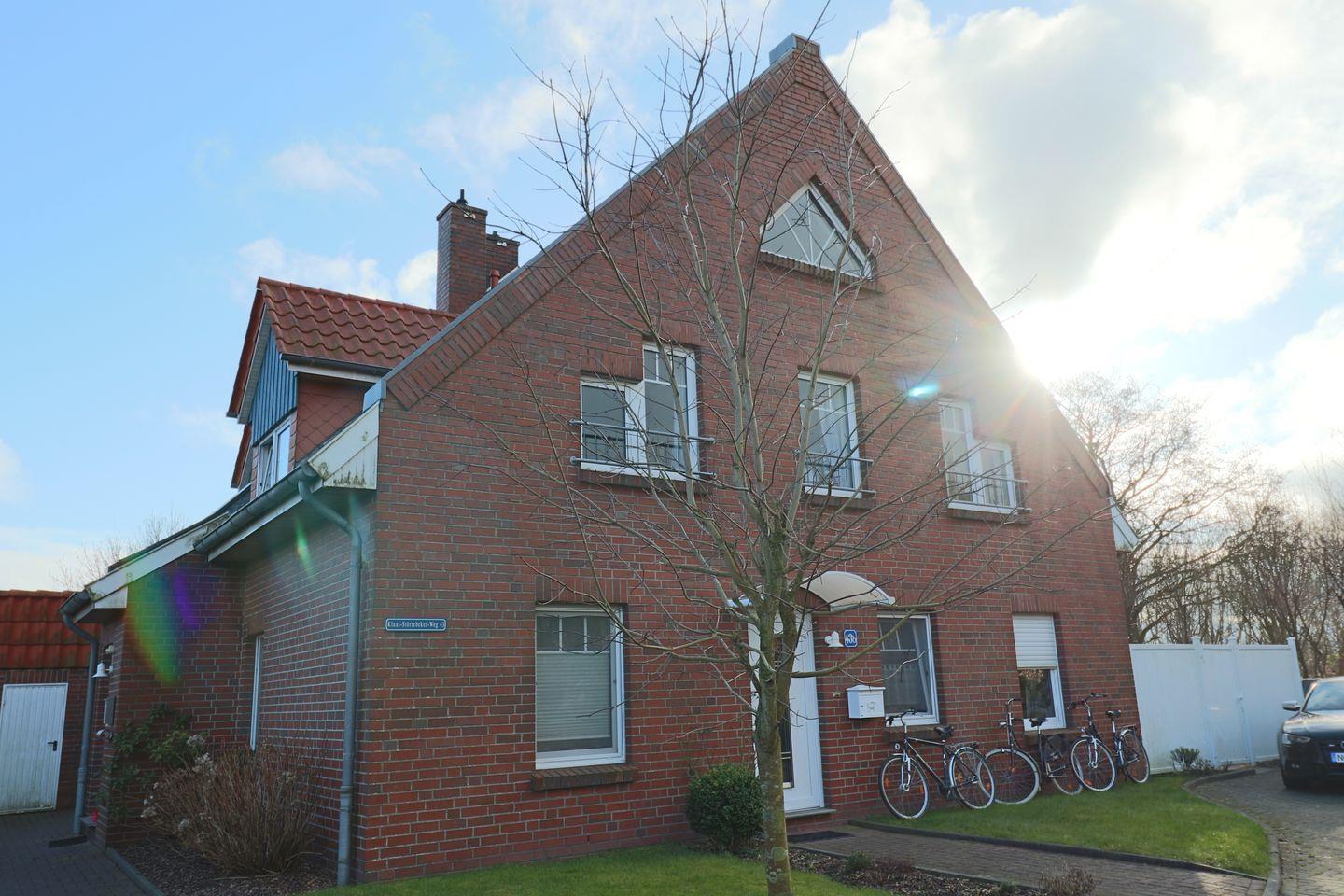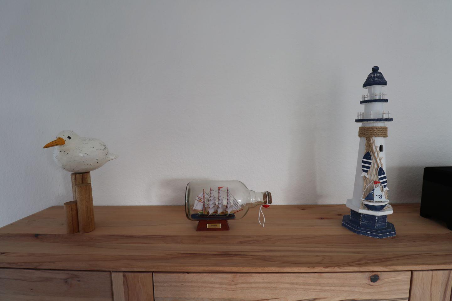 Genießen Sie Ihren Urlaub in dieser großen modernen Maisonettewohnung für bis zu 6 Personen! Ahoi und herzlich Willkommen! Die Oberwohnung liegt in ruhiger Lage, unweit der Zwillingsmühlen. Das großzügige Ferienobjekt im maritimen Look wurde im Jahre 2021/22 komplett renoviert. Sie gelangen über einen separaten Eingang in die Wohnung. Vom Flur aus erreichen Sie alle Räume. Gleich vorne befindet sich die neuwertige vollausgestattete Küche mit Geschirrspüler, Mikrowelle, Senseo- und Kitchenaid-Kaffeemaschine. Nebenan liegt das erste Schlafzimmer, die Käptn´s Koje, mit Doppelbett, das zum Kuscheln und Träumen einlädt. Ein 43" Fernseher sorgt für kuschelige Stunden. Sie finden in der gesamten Wohnung viele liebevolle maritime Details. Das zweite Schlafzimmer, die Matrosenkoje, ist mit einem weißen Etagenbett und Kleiderschrank eingerichtet. Die Deckenlampe als Steuerrad und die Leuchtturmlampe faszinieren so Manchen. Hier gibt es noch einen kleinen Abstellraum. Geradeaus geht es in den Wohn-/Essbereich, in die Käptns-Lounge. Der Raum ist hell und freundlich. Lassen Sie sich das Essen am großen Esstisch aus Massivholz mit modernen Sitzmöbeln schmecken. Ein Internetradio sorgt für jede Stimmung. Im Wohnbereich ist Wohlfühlen groß geschrieben. Die gemütliche Couch und die Sessel laden zum Entspannen ein. Die Deckenlampe mit Farbwechsler und der große Flachbild-TV (50") runden die Gemütlichkeit ab. Von hier haben Sie Zugang zum großen Südbalkon, wo Sie die frische Luft und die Sonnenstrahlen genießen können. Das Bad ist ebenfalls komplett renoviert und lässt mit einer Regendusche keine Wünsche offen. Ein Waschtrockner steht zur Verfügung. Den oberen Bereich erreichen Sie über eine Raumspartreppe. Ein heller Schlaf- und Relaxbereich erwartet Sie! Im Doppelbett lässt es sich fabelhaft schlafen und träumen. 2 Relaxsessel und ein Flachbild-TV sorgen für Entspannung. Das I-Tüpfelchen ist das anliegende neuwertige Bad en Suite mit Regendusche und WC. Dem Eigentümer ist es gelungen, dass Sie sich in dieser Wohnung mit maritimem Flair sofort zu Hause fühlen. WLAN ist verfügbar! Ein Schuppen, wo Sie Ihre mitgebrachten Fahrräder unterbringen können, steht bereit. Ein Parkplatz befindet sich vor dem Haus. Ihr Hund ist hier herzlich willkommen!