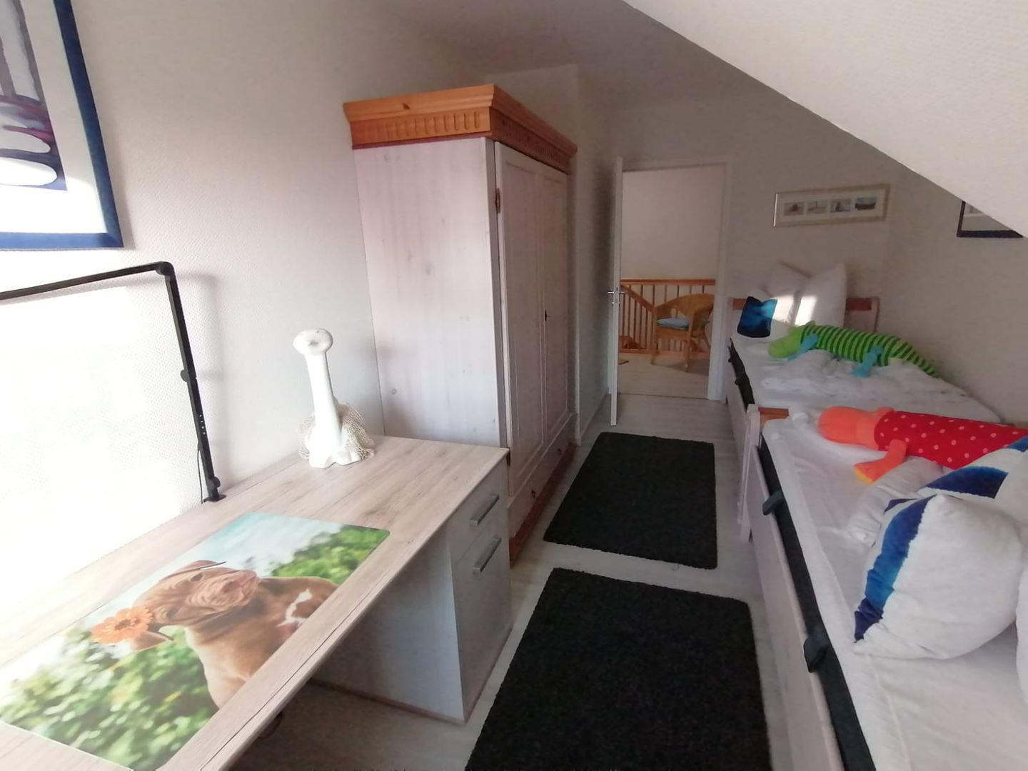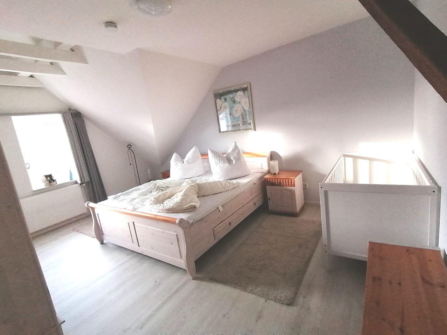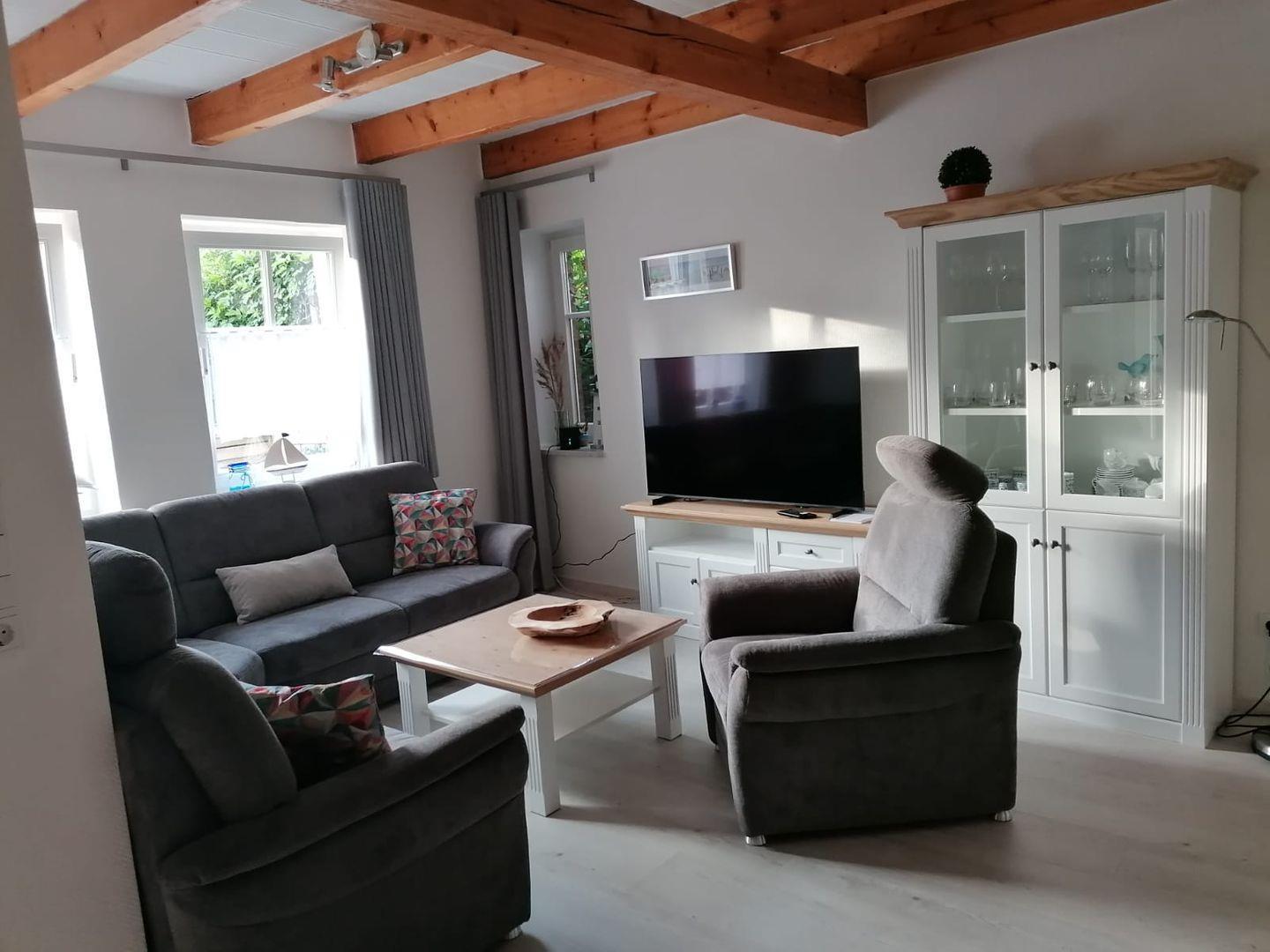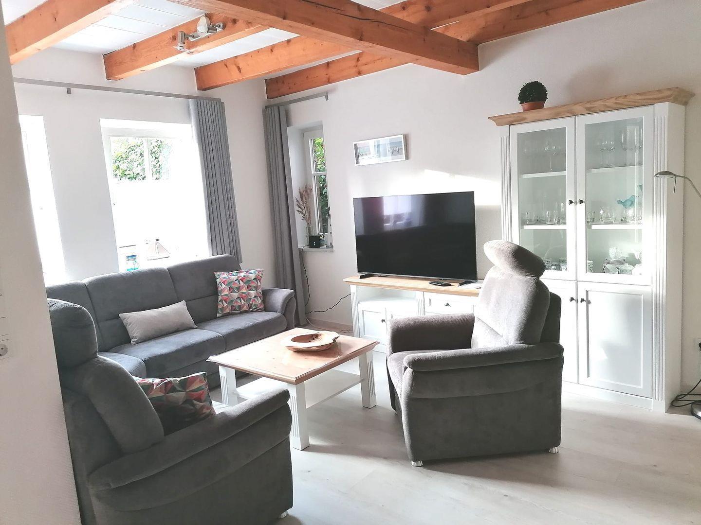 Das gemütliche Ferienhaus Tenne befindet sich im Alten Gulfhof, ruhig aber zentral gelegen. Hier findet die ganze Familie Platz und Ihr Vierbeiner ist auch herzlich willkommen. Kommen Sie herein! Das Objekt wurde Anfang 2025 komplett renoviert. Der große Wohn-Essbereich und Küche mit Balkenlage lädt zu einem Wohlfühlurlaub ein. Der gemütliche Wohnbereich verfügt über 2 bequeme Sofas und einen Sessel. Genießen Sie hier schöne Abende. Der große Flachbild-Fernseher sorgt für Unterhaltung. Am großen Esstisch hat die ganze Familie Platz. Angrenzend befindet sich die vollausgestattete neuwertige Küche. Hier können regionale Gerichte zubereitet werden. Neben dem Wohnbereich finden Sie eine kleine abgetrennte Butze, wo ein weiteres ausziehbares Bett steht, das noch einmal Platz für max. 2 Personen bietet. Im Erdgeschoss befindet sich ebenfalls ein Gäste-WC und ein Abstellraum. Im Obergeschoss liegen die 2 Schlafzimmer, eines mit einem Doppelbett und eines mit 2 Einzelbetten. Ein Kinderbettchen ist vorhanden. Das helle Duschbad liegt ebenso im OG. Hier steht auch eine Waschmaschine. Alles ist hell und freundlich eingerichtet. Die Balken im ganzen Haus vermitteln viel Gemütlichkeit. WLAN und Magenta TV sind verfügbar! Genießen Sie die frische Nordseeluft auf der möblierten Terrasse, lassen Sie die Seele baumeln. Ein Parkplatz ist vorhanden. Mitgebrachte Fahrräder können unter dem zum Gulfhof gehörenden Carport untergestellt werden.