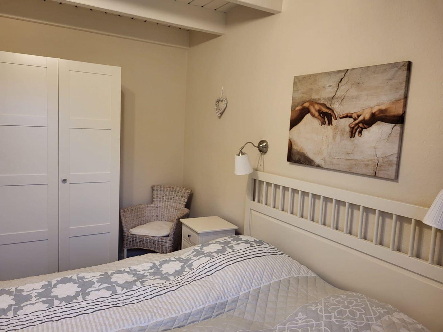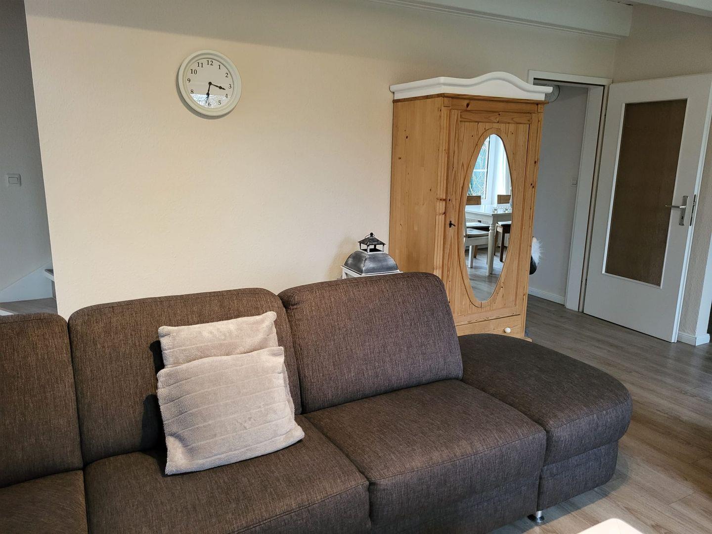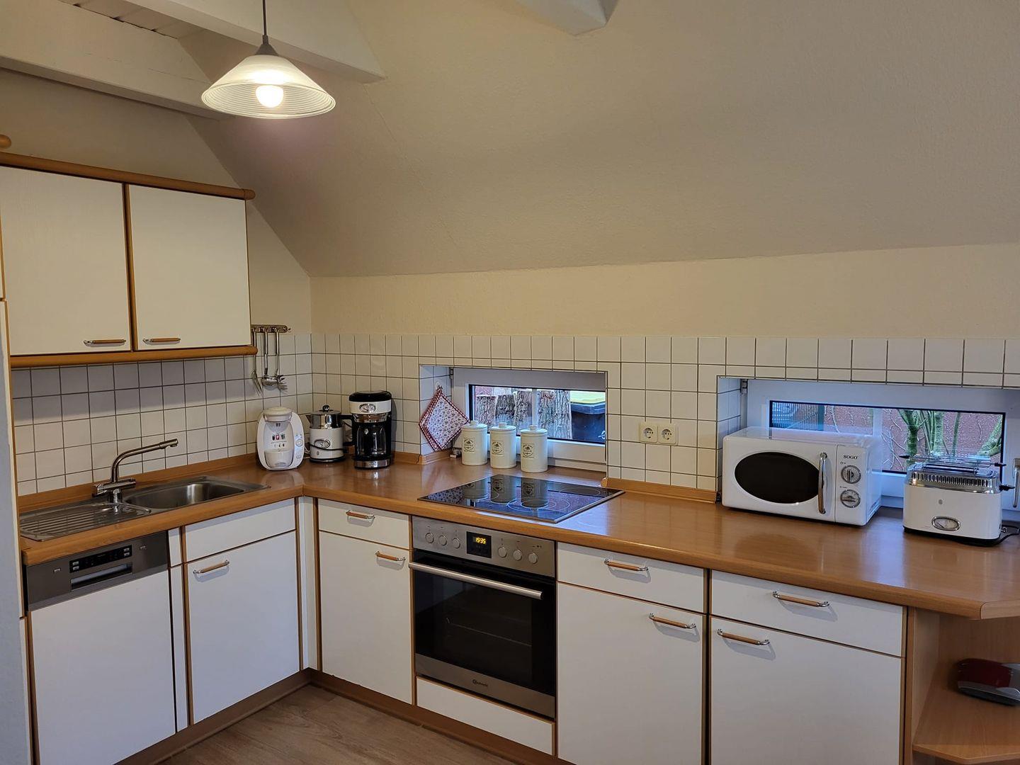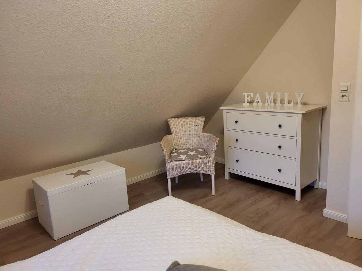 Kommen Sie herein! Vom Flur gelangen Sie in den gemütlichen Wohn-Essbereich mit offener Balkenlage. Sie werden sich gleich wohlfühlen! Die großen hellen Fenster lassen viel Tageslicht herein und Sie haben einen tollen Blick in den Garten. Die Küche ist voll ausgestattet. Hier können leckere Speisen zubereitet werden. Am Esstisch kann dann mit der ganzen Familie zusammen essen und klönen. Die Leseecke lädt zu ruhigen Stunden mit einem spannenden Buch und einer guten Flasche Wein ein. Im Wohnbereich sorgt ein Smart TV für gesellige Fernsehabende auf der gemütlichen Couch . Es stehen auch einige Gesellschaftsspiele und Bücher zur Verfügung. Weiterhin gibt es im Erdgeschoß ein helles Duschbad mit Waschmaschine. Gleich nebenan finden Sie das gemütliche Schlafzimmer mit Doppelbett. Hier können Sie nachts gut entspannen. Im Obergeschoß bietet Haus Anja zwei weitere modern eingerichtete Schlafzimmer eines mit Doppelbett und das andere mit 2 Einzelbetten, wo fabelhaft geträumt werden kann. Ein Gäste-WC befindet sich ebenfalls auf dieser Etage. Für unsere kleinen Gäste stehen ein Reisebett und ein Hochstuhl zur Verfügung.