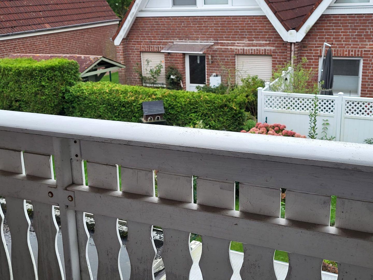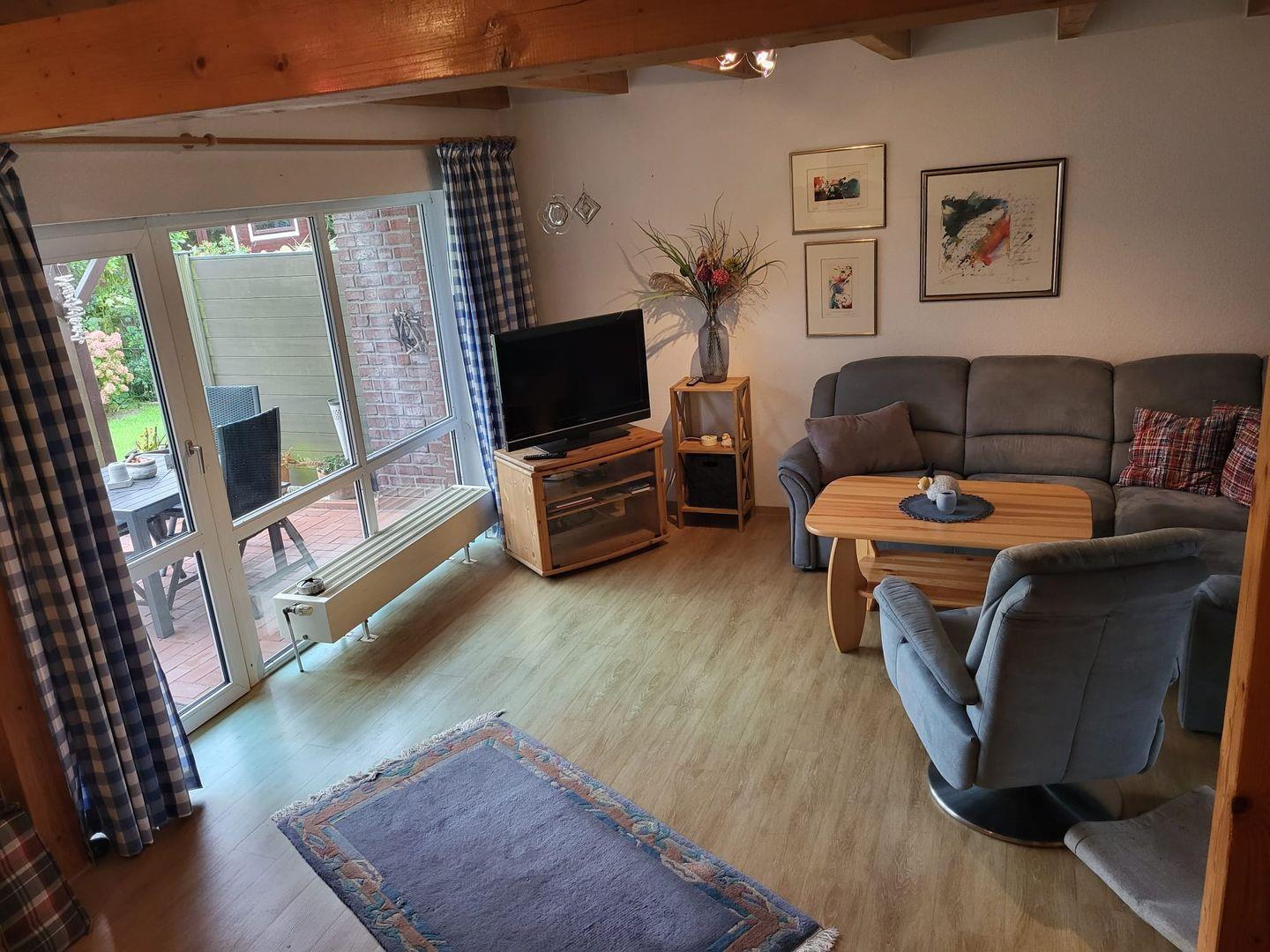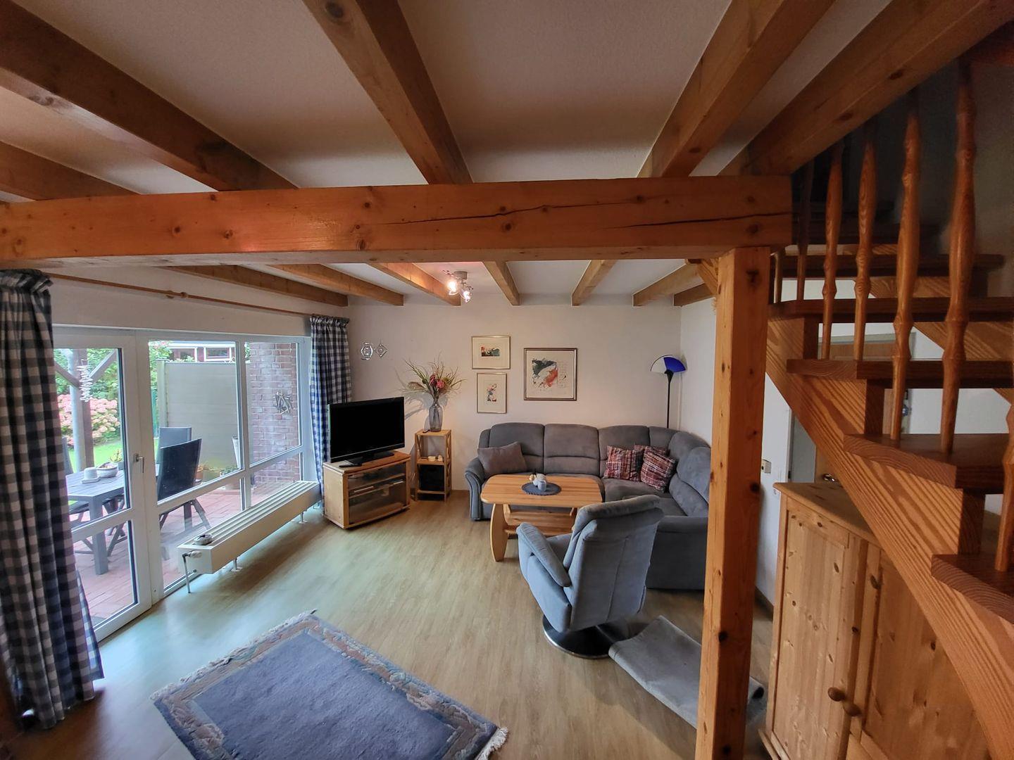Moin und herzlich Willkommen! Vom Flur gelangen Sie in die gemütliche Küche mit Küchenzeile und ein Essplatz direkt am Fenster. Hier kann in Ruhe gefrühstückt und gegessen werden. Gegenüber liegt das helle Badezimmer mit geräumiger Dusche. Der große Wohnbereich mit Balkenlage strahlt Gemütlichkeit aus. Auf der bequemen Couch mit Drehsessel können Sie fabelhaft entspannen. Durch die großen Fenster haben Sie einen tollen Blick in den Garten. Von hier gelangen Sie auf die überdachte Terrasse. So können Sie bei jedem Wetter die frische Nordseeluft genießen. Das Obergeschoß bietet 2 Schlafräume, die beide mit jeweils einem Doppelbett (Größe je 160 x 200 cm) und einem Fernseher ausgestattet sind. Hier kann man so manche Abende entspannt ausklingen lassen. Ein Gäste-WC rundet die obere Etage ab.