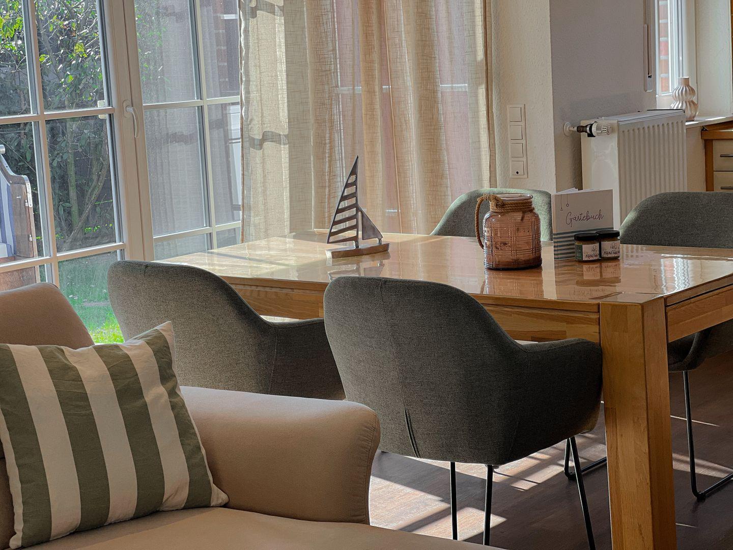 Die 76 qm große Erdgeschosswohnung Lachmöwe befindet sich am Ende einer Sackgasse und verfügt neben einem großzügigen Garten auch über einen PKW-Stellplatz am Haus. Sie bietet bis zu 4 Personen alles was für eine erholsame Auszeit an der Küste benötigt wird; so befindet sich neben einem Holzkamin auch eine Sauna in der Wohnung.
